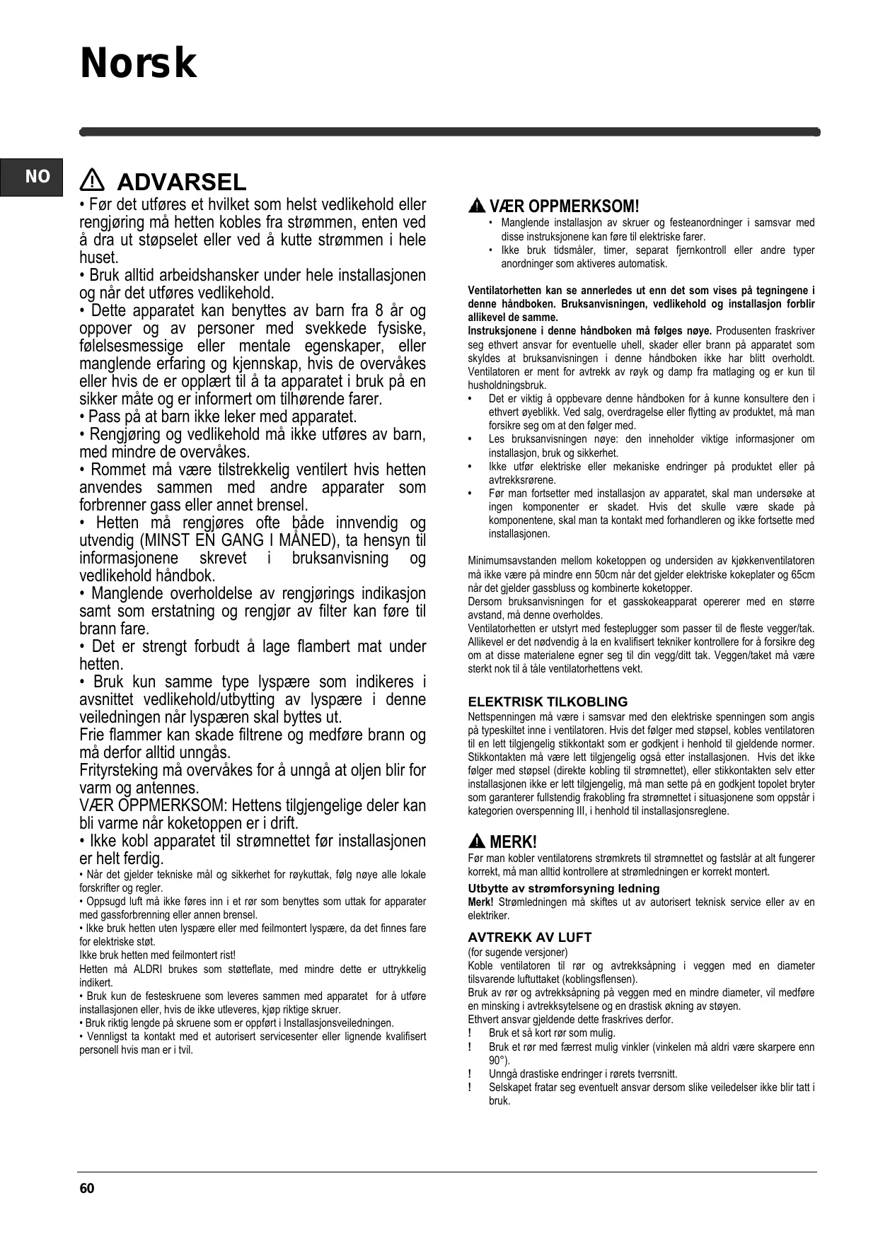 • Før det utføres et hvilket som helst vedlikehold eller rengjøring må hetten kobles fra strømmen, enten ved å dra ut støpselet eller ved å kutte strømmen i hele huset. • Bruk alltid arbeidshansker under hele installasjonen og når det utføres vedlikehold. • Dette apparatet kan benyttes av barn fra 8 år og oppover og av personer med svekkede fysiske, følelsesmessige eller mentale egenskaper, eller manglende erfaring og kjennskap, hvis de overvåkes eller hvis de er opplært til å ta apparatet i bruk på en sikker måte og er informert om tilhørende farer. • Pass på at barn ikke leker med apparatet. • Rengjøring og vedlikehold må ikke utføres av barn, med mindre de overvåkes. • Rommet må være tilstrekkelig ventilert hvis hetten anvendes sammen med andre apparater som forbrenner gass eller annet brensel. • Hetten må rengjøres ofte både innvendig og utvendig (MINST EN GANG I MÅNED), ta hensyn til informasjonene skrevet i bruksanvisning og vedlikehold håndbok. • Manglende overholdelse av rengjørings indikasjon samt som erstatning og rengjør av filter kan føre til brann fare. • Det er strengt forbudt å lage flambert mat under hetten. • Bruk kun samme type lyspære som indikeres i avsnittet vedlikehold/utbytting av lyspære i denne veiledningen når lyspæren skal byttes ut. Frie flammer kan skade filtrene og medføre brann og må derfor alltid unngås. Frityrsteking må overvåkes for å unngå at oljen blir for varm og antennes. VÆR OPPMERKSOM: Hettens tilgjengelige deler kan bli varme når koketoppen er i drift. • Ikke kobl apparatet til strømnettet før installasjonen er helt ferdig. • Når det gjelder tekniske mål og sikkerhet for røykuttak, følg nøye alle lokale forskrifter og regler. • Oppsugd luft må ikke føres inn i et rør som benyttes som uttak for apparater med gassforbrenning eller annen brensel. • Ikke bruk hetten uten lyspære eller med feilmontert lyspære, da det finnes fare for elektriske støt. Ikke bruk hetten med feilmontert rist! Hetten må ALDRI brukes som støtteflate, med mindre dette er uttrykkelig indikert. • Bruk kun de festeskruene som leveres sammen med apparatet for å utføre installasjonen eller, hvis de ikke utleveres, kjøp riktige skruer. • Bruk riktig lengde på skruene som er oppført i Installasjonsveiledningen. • Vennligst ta kontakt med et autorisert servicesenter eller lignende kvalifisert personell hvis man er i tvil.