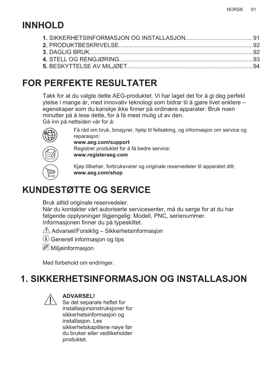 FOR PERFEKTE RESULTATER Takk for at du valgte dette AEG-produktet. Vi har laget det for å gi deg perfekt ytelse i mange år, med innovativ teknologi som bidrar til å gjøre livet enklere – egenskaper som du kanskje ikke finner på ordinære apparater. Bruk noen minutter på å lese dette, for å få mest mulig ut av den.