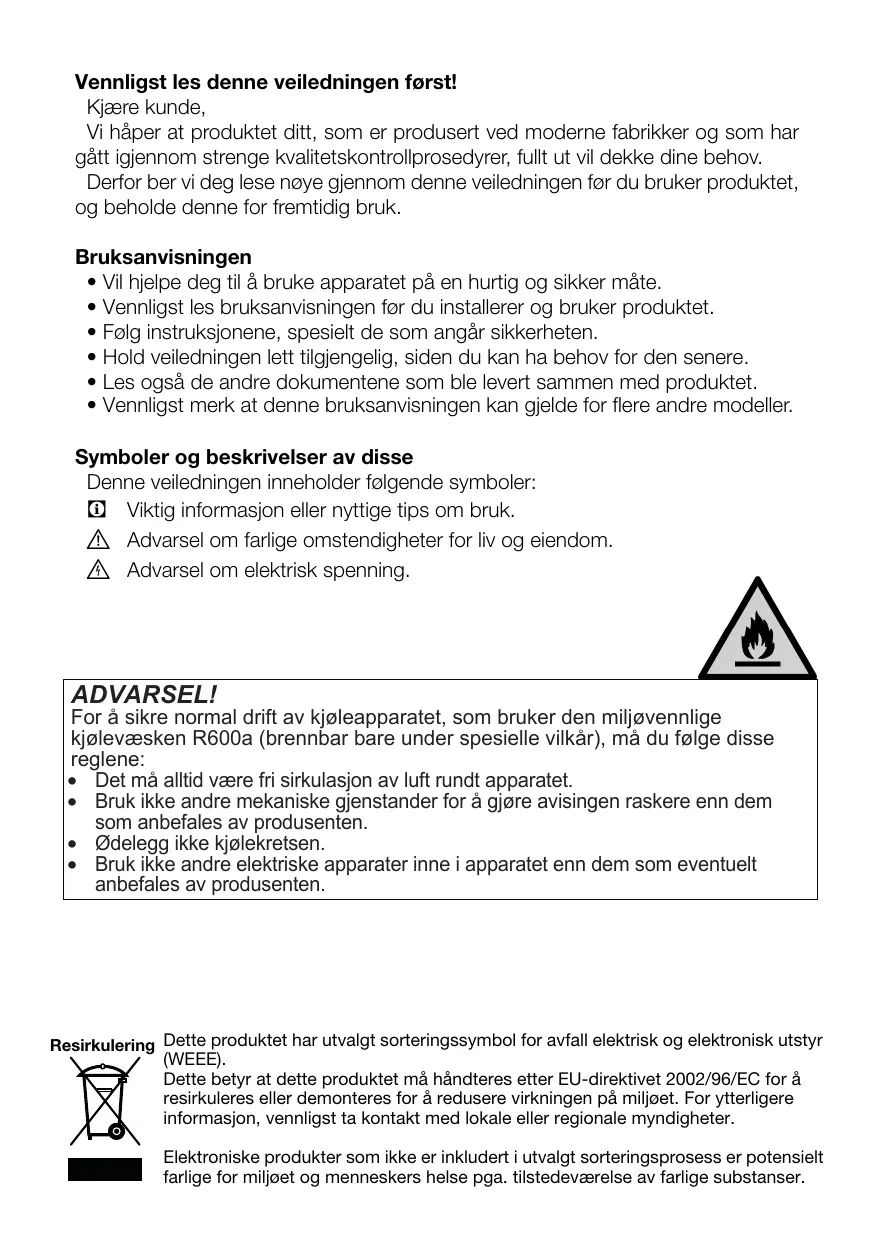 For å sikre normal drift av kjøleapparatet, som bruker den miljøvennlige kjølevæsken R600a (brennbar bare under spesielle vilkår), må du følge disse reglene: • Det må alltid være fri sirkulasjon av luft rundt apparatet. • Bruk ikke andre mekaniske gjenstander for å gjøre avisingen raskere enn dem som anbefales av produsenten. • Ødelegg ikke kjølekretsen. • Bruk ikke andre elektriske apparater inne i apparatet enn dem som eventuelt anbefales av produsenten.