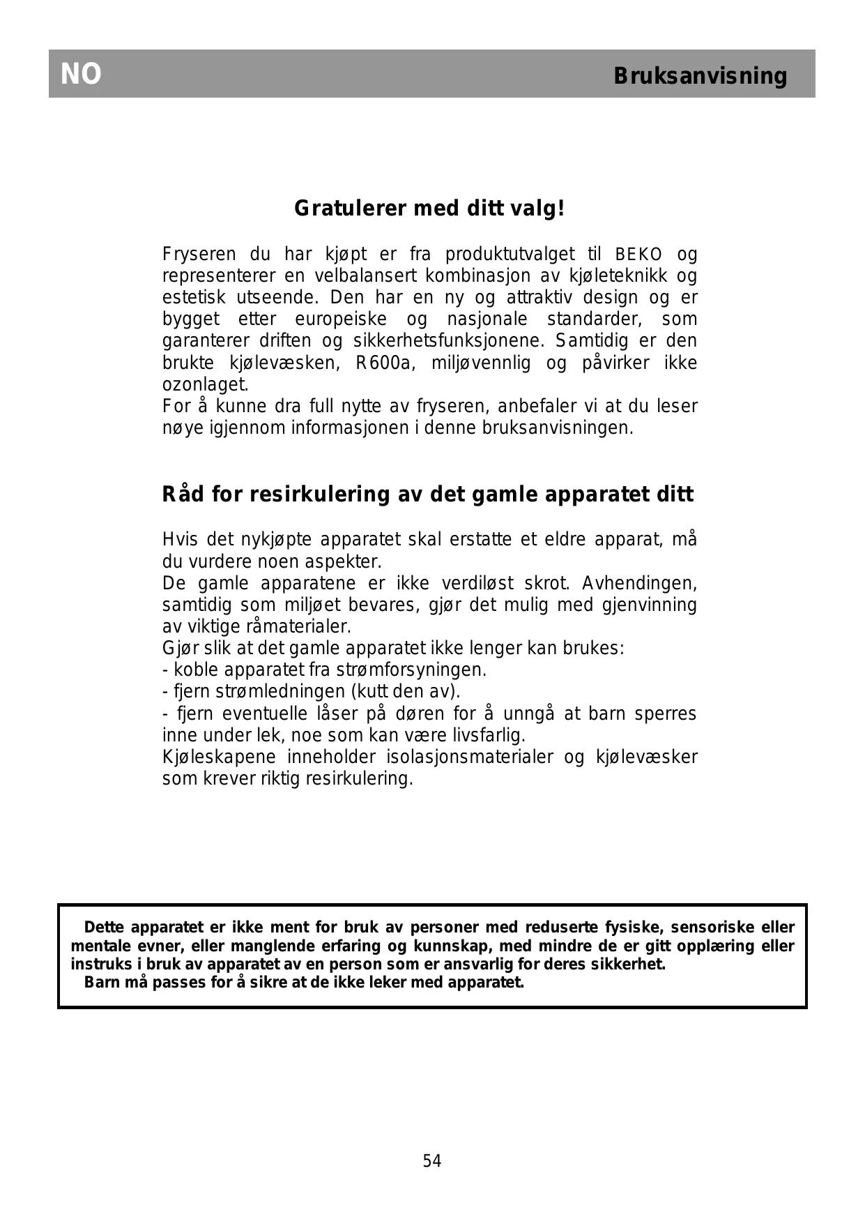 Gratulerer med ditt valg! Fryseren du har kjøpt er fra produktutvalget til BEKO og representerer en velbalansert kombinasjon av kjøleteknikk og estetisk utseende. Den har en ny og attraktiv design og er bygget etter europeiske og nasjonale standarder, som garanterer driften og sikkerhetsfunksjonene. Samtidig er den brukte kjølevæsken, R600a, miljøvennlig og påvirker ikke ozonlaget. For å kunne dra full nytte av fryseren, anbefaler vi at du leser nøye igjennom informasjonen i denne bruksanvisningen.