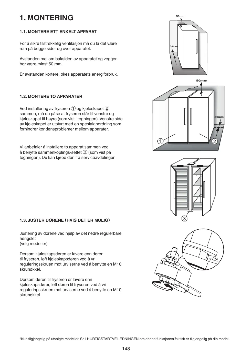 à gauche et le réfrigérateur à droite (comme indiqué dans le schéma). Sur le côté gauche du réfrigérateur se trouve un dispositif spécial permettant d'éviter les problèmes de condensation entre les appareils. Nous vous recommandons d'installer deux appareils ensemble à l'aide du kit de fixation 3 (comme illustré dans le schéma). Vous pouvez acquérir ce kit auprès du Service Après-Vente.
