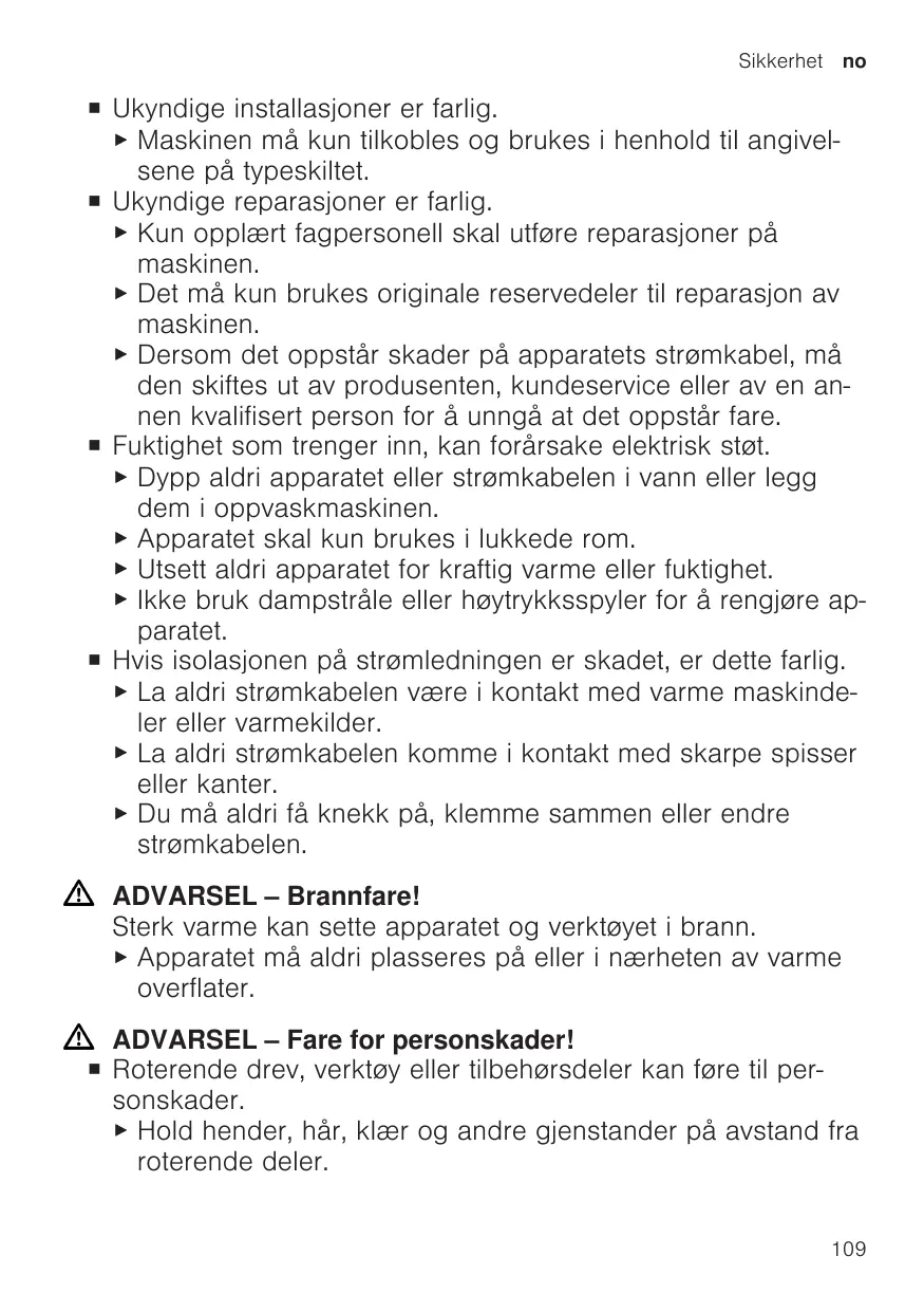 ▶ Pour le raccordement et l’utilisation de l’appareil, respectez impérativement les indications figurant sur la plaque signalétique. Les réparations non conformes sont dangereuses. ▶ Seul un personnel dûment qualifié peut entreprendre des réparations sur l'appareil. ▶ Seules des pièces de rechange d'origine peuvent être utilisées pour réparer l'appareil. ▶ Afin d’écarter tout danger quand le cordon d’alimentation secteur de cet appareil est endommagé, seul le fabricant ou son service après-vente ou toute autre personne de qualification équivalente est habilité à le remplacer. L’infiltration d’humidité peut occasionner un choc électrique. ▶ Ne jamais plonger l’appareil ou le cordon d’alimentation secteur dans l’eau et ne pas les mettre au lave-vaisselle. ▶ Utiliser l’appareil uniquement dans des pièces fermées. ▶ Ne jamais exposer l’appareil à une forte chaleur ou humidité. ▶ Ne pas utiliser de nettoyeur vapeur ou haute pression pour nettoyer l’appareil. Le cordon d'alimentation pose un danger si sa gaine de protection est endommagée. ▶ Ne mettez jamais en contact le cordon d'alimentation avec des sources de chaleur et des pièces chaudes de l'appareil. ▶ Ne mettez jamais en contact le cordon d'alimentation avec des pointes acérées ou arêtes tranchantes. ▶ Ne pliez, écrasez ou modifiez jamais le cordon d'alimentation. 43
