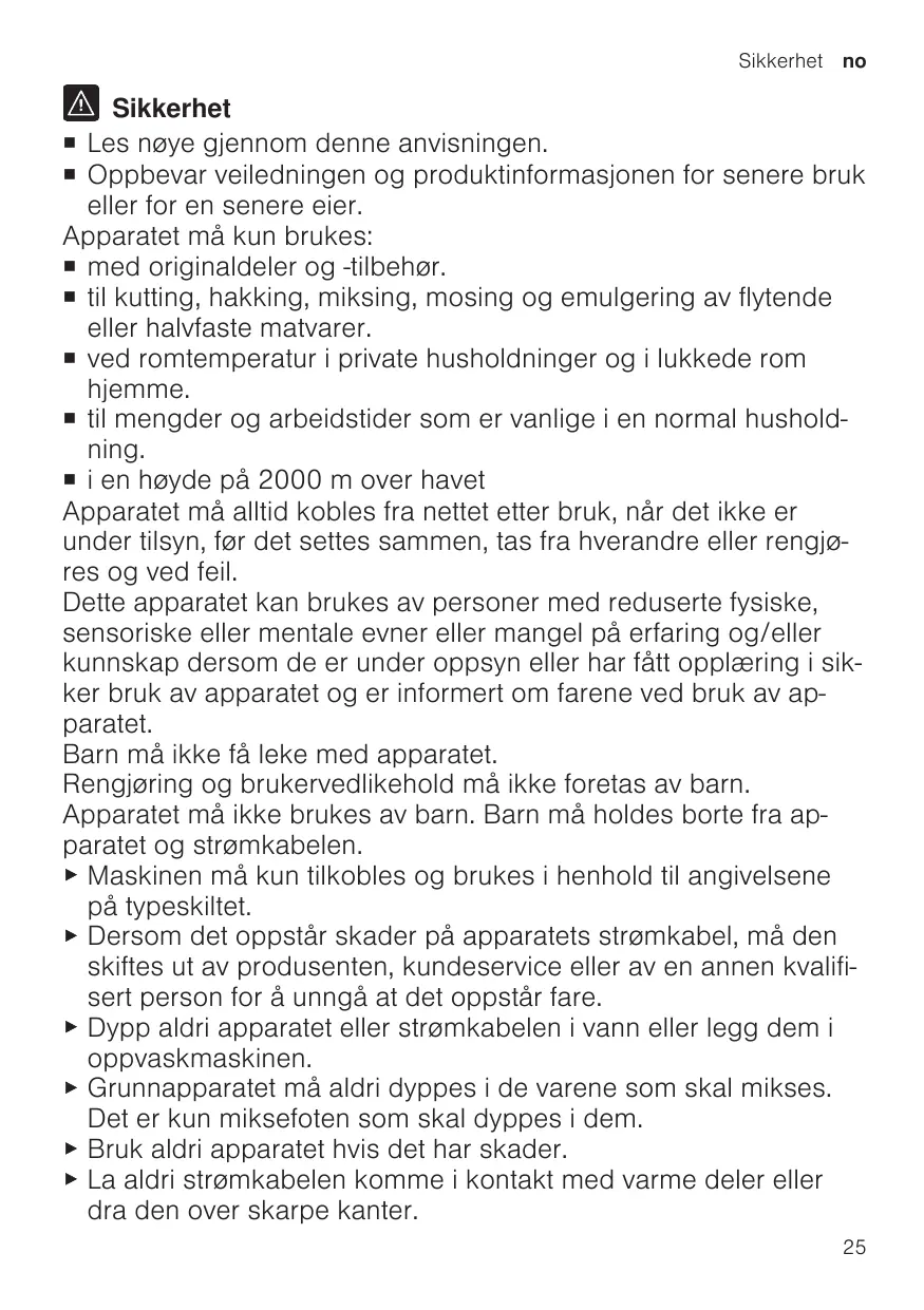 ¡ Read this instruction manual carefully. ¡ Keep the instruction manual and the product information safe for future reference or for the next owner. ¡ pour broyer, hacher, mixer, réduire en purée et émulsionner des produits alimentaires liquides ou mi-ferme. ¡ pour un usage domestique privé et dans les pièces fermées d’un domicile, à la température ambiante. ¡ pour les quantités de préparation et durées de traitement habituelles pour un ménage. ¡ à une hauteur maximale de 2000 m au-dessus du niveau de la mer. L’appareil doit toujours être débranché du secteur, après chaque utilisation, lorsqu’il n’est pas sous surveillance, lorsqu’il doit être monté ou démonté, avant de le nettoyer et en cas de panne. Cet appareil peut être utilisé par des personnes aux capacités physiques, sensorielles ou mentales réduites ou des personnes inexpérimentées, à condition qu'elles soient surveillées ou qu'elles aient été informées de l'utilisation de l'appareil et qu'elles comprennent les risques inhérents à son usage. Les enfants ne sont pas autorisés à jouer avec l'appareil. Le nettoyage et l’entretien de l'appareil ne doivent pas être effectués par des enfants. L'appareil ne doit pas être utilisé par des enfants. Les enfants doivent être tenus à distance de l’appareil et du cordon d’alimentation secteur. ▶ Pour le raccordement et l’utilisation de l’appareil, respectez impérativement les indications figurant sur la plaque signalétique. ▶ Afin d’écarter tout danger quand le cordon d’alimentation secteur de cet appareil est endommagé, seul le fabricant ou son service après-vente ou toute autre personne de qualification équivalente est habilité à le remplacer. ▶ Ne jamais plonger l’appareil ou le cordon d’alimentation secteur dans l’eau et ne pas les mettre au lave-vaisselle. 13