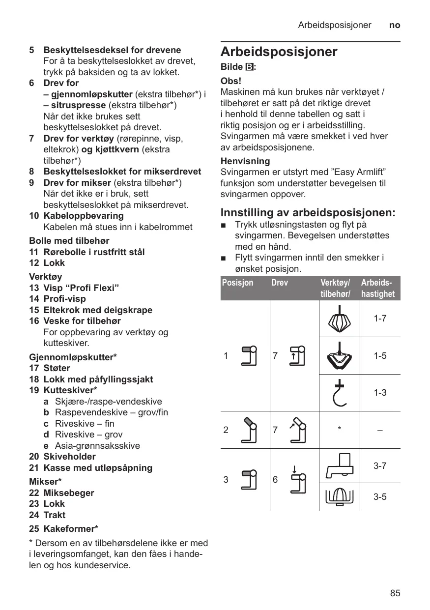 Figure A : « Positions de travail »). 3 Interrupteur rotatif Après l’extinction (position P), l’appareil se rend automatiquement sur la position optimale pour changer les accessoires. P = Arrêt M = Touche pulse, avec vitesse la plus élevée, maintenez l’interrupteur pendant la durée de fonctionnement souhaitée. Vitesse 1-7, vitesse de travail : 1 = vitesse basse – marche lente, 7 = vitesse élevée – marche rapide. Il clignote en cas d’erreurs pendant l’utilisation de l’appareil, si le fusible électronique disjoncte ou en présence d’un défaut dans l’appareil, voir le chapitre « Aide en cas de dérangement ». 5 Couvercle protégeant le mécanisme d’entraînement Pour retirer le couvercle protégeant l’entraînement, appuyez sur la zone arrière puis retirez le couvercle. 6 Entraînement pour – accessoire râpeur / éminceur (accessoire en option*) et – presse-agrumes (accessoire en option*) Lorsque vous n’utilisez pas l’entraîne ment, protégez-le avec son couvercle. 7 Entraînement pour les accessoires (fouet mélangeur, fouet batteur, crochet pétrisseur) et hachoir à viande (accessoire en option*) 8 Couvercle protégeant l’entraînement du mixeur 9 Entraînement du bol mixeur (accessoire en option*) Lorsque vous n’utilisez pas l’entraînement, protégez-le avec son couvercle. 10 Rangement du cordon Placez le cordon d’alimentation dans son rangement Bol mélangeur avec accessoires 11 Bol mélangeur en acier inoxydable 12 Couvercle Accessoires « Easy Armlift » qui assiste le mouvement montant du bras pivotant.