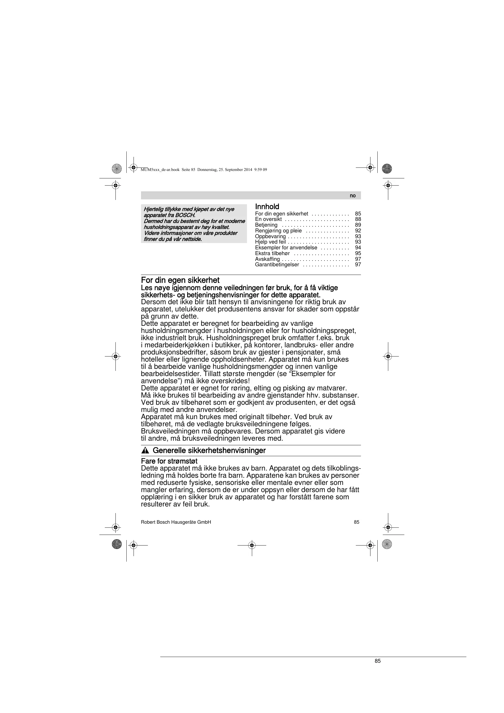 , Generelle sikkerhetshenvisninger Fare for strømstøt Dette apparatet må ikke brukes av barn. Apparatet og dets tilkoblingsledning må holdes borte fra barn. Apparatene kan brukes av personer med reduserte fysiske, sensoriske eller mentale evner eller som mangler erfaring, dersom de er under oppsyn eller dersom de har fått opplæring i en sikker bruk av apparatet og har forstått farene som resulterer av feil bruk. Robert Bosch Hausgeräte GmbH