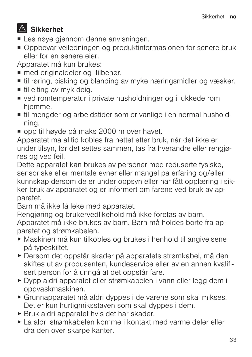 ¡ pour mélanger, battre et mixer des aliments tendres et des liquides. ¡ pour pétrir de la pâte molle. ¡ pour un usage domestique privé et dans les pièces fermées d’un domicile, à la température ambiante. ¡ pour les quantités de préparation et durées de traitement habituelles pour un ménage. ¡ à une hauteur maximale de 2000 m au-dessus du niveau de la mer. L’appareil doit toujours être débranché du secteur, après chaque utilisation, lorsqu’il n’est pas sous surveillance, lorsqu’il doit être monté ou démonté, avant de le nettoyer et en cas de panne. Cet appareil peut être utilisé par des personnes aux capacités physiques, sensorielles ou mentales réduites ou des personnes inexpérimentées, à condition qu'elles soient surveillées ou qu'elles aient été informées de l'utilisation de l'appareil et qu'elles comprennent les risques inhérents à son usage. Les enfants ne sont pas autorisés à jouer avec l'appareil. Le nettoyage et l’entretien de l'appareil ne doivent pas être effectués par des enfants. L'appareil ne doit pas être utilisé par des enfants. Les enfants doivent être tenus à distance de l’appareil et du cordon d’alimentation secteur. ▶ Pour le raccordement et l’utilisation de l’appareil, respectez impérativement les indications figurant sur la plaque signalétique. ▶ Afin d’écarter tout danger quand le cordon d’alimentation secteur de cet appareil est endommagé, seul le fabricant ou son service après-vente ou toute autre personne de qualification équivalente est habilité à le remplacer. 17