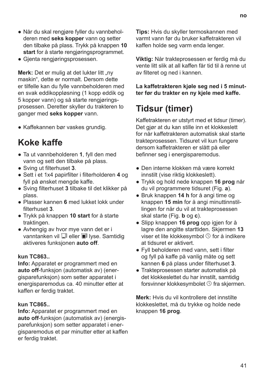 ●● Pulse ahora la tecla 10 start (inicio). Se inicia la preparación del café. ●● Dependiendo de lo lleno que esté el recipiente para agua se enciende J o L. Al mismo tiempo, se activa la función auto off. Sólo TC863.. Información: El aparato está programado con una desconexión automática auto off (ahoro de energía) que lo hace pasar a modo ahorro aprox. 40 minutos después de estar preparado el café. ●● Ajuste ahora con la tecla 14 h la hora y con la tecla 15 min los minutos en los que comenzará a prepararse el café (Figuras b y c). ●● Suelte ahora la tecla 16 prog para guardar el ajuste. En el display 13 se enciende un pequeño reloj V que indica que la función de temporizador está activada. ●● Llene la máquina de agua y café en la forma habitual y coloque la jarra 6 debajo de la carcasa de filtro 3. ●● El café comienza a prepararse automáti camente a la hora ajustada y el pequeño reloj V se apaga.