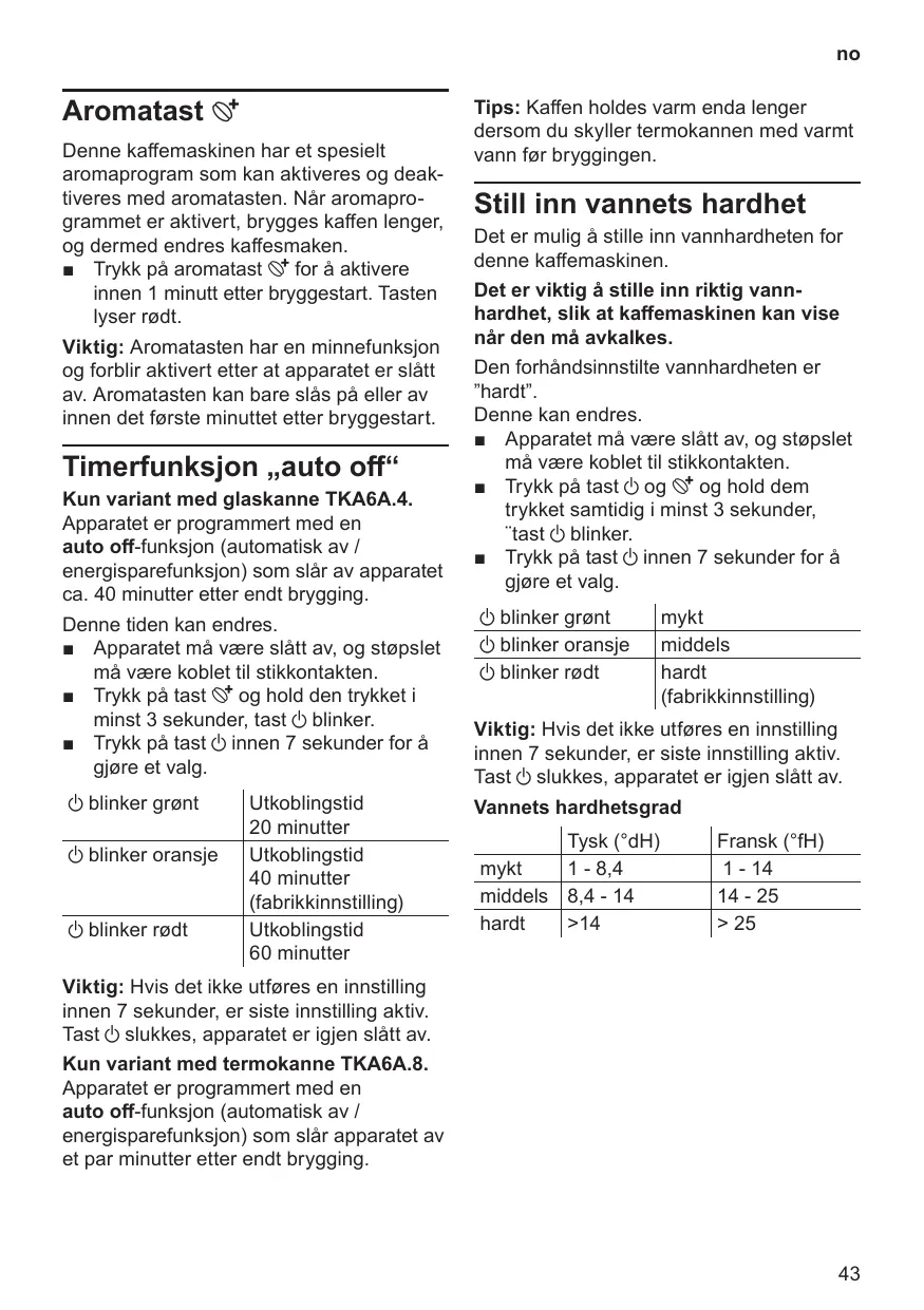 Es importante ajustar correctamente la dureza del agua para que la cafetera pueda indicar a tiempo el momento en que se debe descalcificar. El aparato viene ajustado de fábrica al grado de dureza «dura». Este ajuste puede modificarse: ■■ La cafetera debe estar desconectada y el enchufe conectado a la toma de corriente. ■■ Pulse las teclas a y ã simultánea mente al menos durante 3 segundos; la tecla a parpadea. ■■ Limpie la carcasa por fuera sólo con un paño húmedo, no utilice productos de limpieza afilados ni abrasivos. ■■ Limpie el recipiente para agua con agua corriente y no utilice cepillos duros. Sólo en la variante con jarra de cristal TKA6A.4. ■■ La jarra de cristal con tapa puede meterse en el lavavajillas. Sólo en la variante con jarra térmica TKA6A.8. ■■ Enjuague la jarra térmica con tapa y limpie el exterior con un paño húmedo. No la lave en el lavavajillas ni con agua de fregado. Consejo: Los restos de suciedad más adheridos pueden eliminarse con una solución de soda, detergente para lavavajillas o pastillas para limpieza de dentaduras postizas. ■■ Conserve la jarra térmica con la tapa abierta para evitar olores y la formación de bacterias.