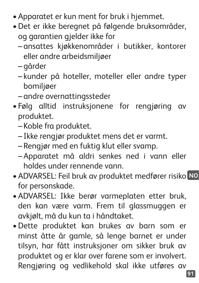 • Cet appareil est conçu pour un usage domestique seulement. • Il n’est pas conçu pour être utilisé dans les situations suivantes et sa garantie ne s’appliquera pas dans les cas suivants : ––dans les cuisines réservées au personnel des magasins, bureauxou autres environnements professionnels ; ––dans les fermes ; ––par les clients des hôtels, motels et autres environnements de type résidentiel ; ––dans des environnements de type chambres d’hôtes. • Toujours suivre les instructions pour nettoyer votre appareil : ––Débrancher l’appareil. ––Ne pas nettoyer l’appareil s’il est encore chaud. ––Nettoyer avec un chiffon ou une éponge humide. ––Ne pas plonger l’appareil dans l’eau ou sous l’eau courante. • AVERTISSEMENT : Risques de blessures en cas de mauvaise utilisation de l’appareil. 20