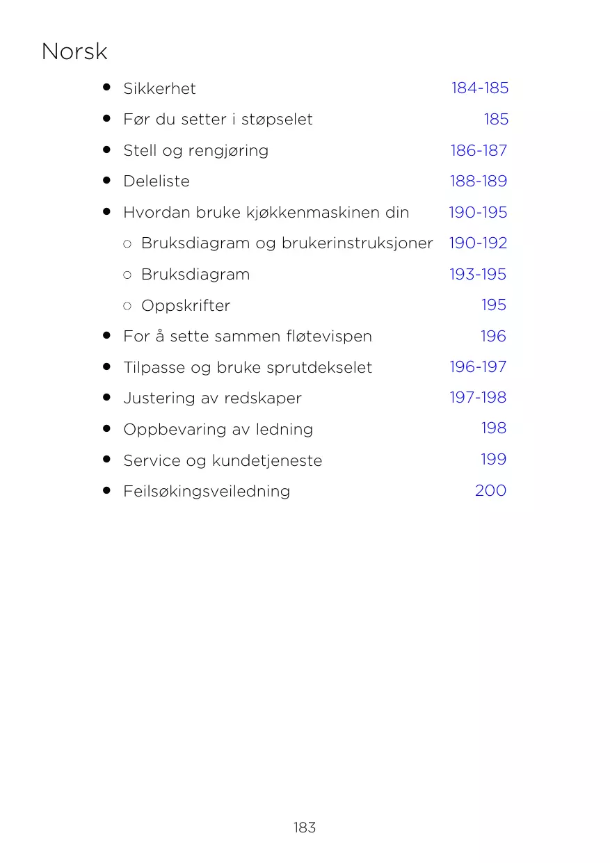 O Bolle i rustfritt stål O Vask for hånd og tørk grundig, eller vask i oppvaskmaskin. O Bruk aldri stålbørste, stålull eller klorin til å rengjøre bollen av rustfritt stål. Bruk eddik til å fjerne kalkavleiringer. O Hold unna sterk varme (komfyrplater, ovner, mikrobølgeovner). Redskapene og sprutdekselet O Vask for hånd og tørk grundig, eller vask i oppvaskmaskin. Fløtevispen O Ta alltid av slikkepottkanten fra redskapet før rengjøring. O Vask slikkepottkanten og redskapet i varmt såpevann, og tørk grundig. Alternativt kan du vaske delene i oppvaskmaskinen. Merk: Sjekk hvilken stand redskapet er i før o og etter bruk, og sjekk også regelmessig slikkepottkantens stand, og erstatt den hvis den viser tegn på slitasje. Glassbolle O Vask bollen i varmt såpevann, og tørk godt. O Alternativt kan bollen vaskes i oppvaskmaskin.