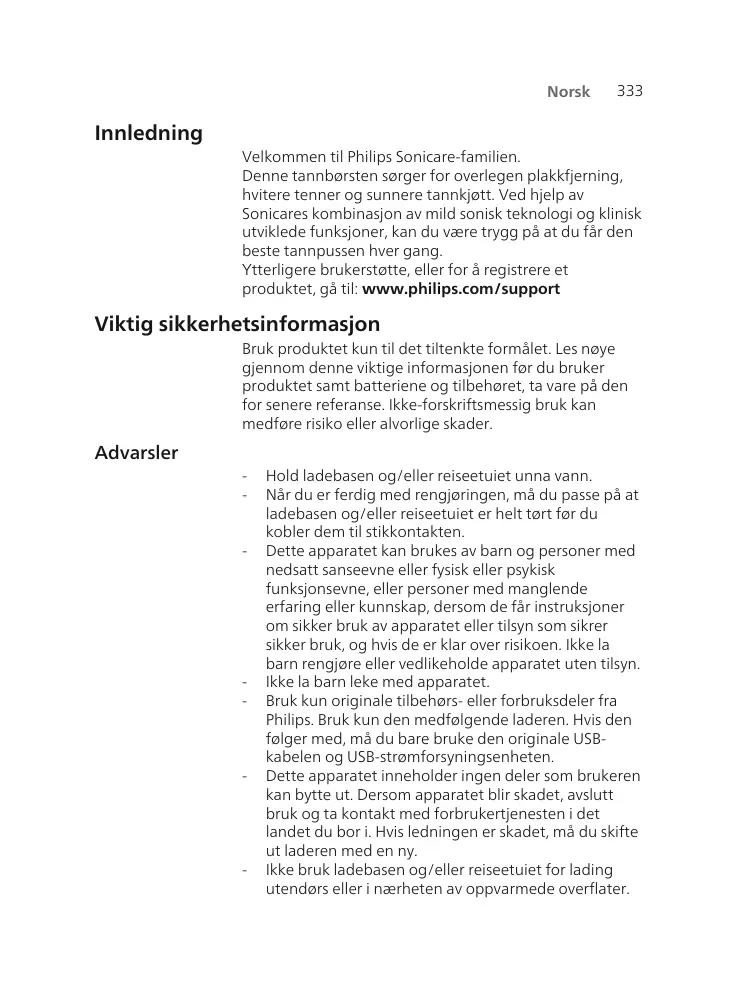 Hold ladebasen og/eller reiseetuiet unna vann. Når du er ferdig med rengjøringen, må du passe på at ladebasen og/eller reiseetuiet er helt tørt før du kobler dem til stikkontakten. Dette apparatet kan brukes av barn og personer med nedsatt sanseevne eller fysisk eller psykisk funksjonsevne, eller personer med manglende erfaring eller kunnskap, dersom de får instruksjoner om sikker bruk av apparatet eller tilsyn som sikrer sikker bruk, og hvis de er klar over risikoen. Ikke la barn rengjøre eller vedlikeholde apparatet uten tilsyn. Ikke la barn leke med apparatet. Bruk kun originale tilbehørs- eller forbruksdeler fra Philips. Bruk kun den medfølgende laderen. Hvis den følger med, må du bare bruke den originale USBkabelen og USB-strømforsyningsenheten. Dette apparatet inneholder ingen deler som brukeren kan bytte ut. Dersom apparatet blir skadet, avslutt bruk og ta kontakt med forbrukertjenesten i det landet du bor i. Hvis ledningen er skadet, må du skifte ut laderen med en ny. Ikke bruk ladebasen og/eller reiseetuiet for lading utendørs eller i nærheten av oppvarmede overflater.
