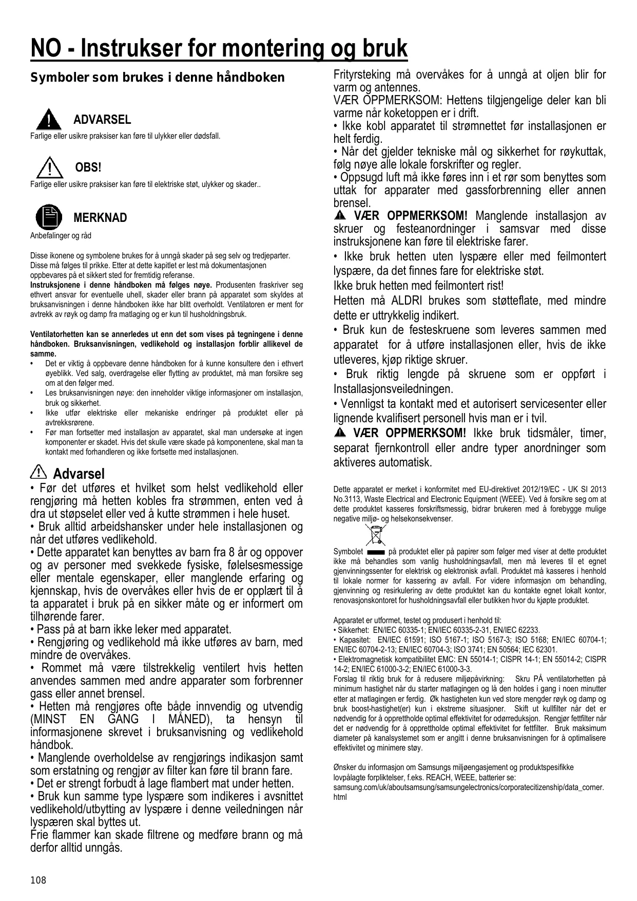 Symbolet på produktet eller på papirer som følger med viser at dette produktet ikke må behandles som vanlig husholdningsavfall, men må leveres til et egnet gjenvinningssenter for elektrisk og elektronisk avfall. Produktet må kasseres i henhold til lokale normer for kassering av avfall. For videre informasjon om behandling, gjenvinning og resirkulering av dette produktet kan du kontakte egnet lokalt kontor, renovasjonskontoret for husholdningsavfall eller butikken hvor du kjøpte produktet. Apparatet er utformet, testet og produsert i henhold til: • Sikkerhet: EN/IEC 60335-1; EN/IEC 60335-2-31, EN/IEC 62233. • Kapasitet: EN/IEC 61591; ISO 5167-1; ISO 5167-3; ISO 5168; EN/IEC 60704-1; EN/IEC 60704-2-13; EN/IEC 60704-3; ISO 3741; EN 50564; IEC 62301. • Elektromagnetisk kompatibilitet EMC: EN 55014-1; CISPR 14-1; EN 55014-2; CISPR 14-2; EN/IEC 61000-3-2; EN/IEC 61000-3-3. Forslag til riktig bruk for å redusere miljøpåvirkning: Skru PÅ ventilatorhetten på minimum hastighet når du starter matlagingen og lå den holdes i gang i noen minutter etter at matlagingen er ferdig. Øk hastigheten kun ved store mengder røyk og damp og bruk boost-hastighet(er) kun i ekstreme situasjoner. Skift ut kullfilter når det er nødvendig for å opprettholde optimal effektivitet for odørreduksjon. Rengjør fettfilter når det er nødvendig for å opprettholde optimal effektivitet for fettfilter. Bruk maksimum diameter på kanalsystemet som er angitt i denne bruksanvisningen for å optimalisere effektivitet og minimere støy. Ønsker du informasjon om Samsungs miljøengasjement og produktspesifikke lovpålagte forpliktelser, f.eks. REACH, WEEE, batterier se: samsung.com/uk/aboutsamsung/samsungelectronics/corporatecitizenship/data_corner. html