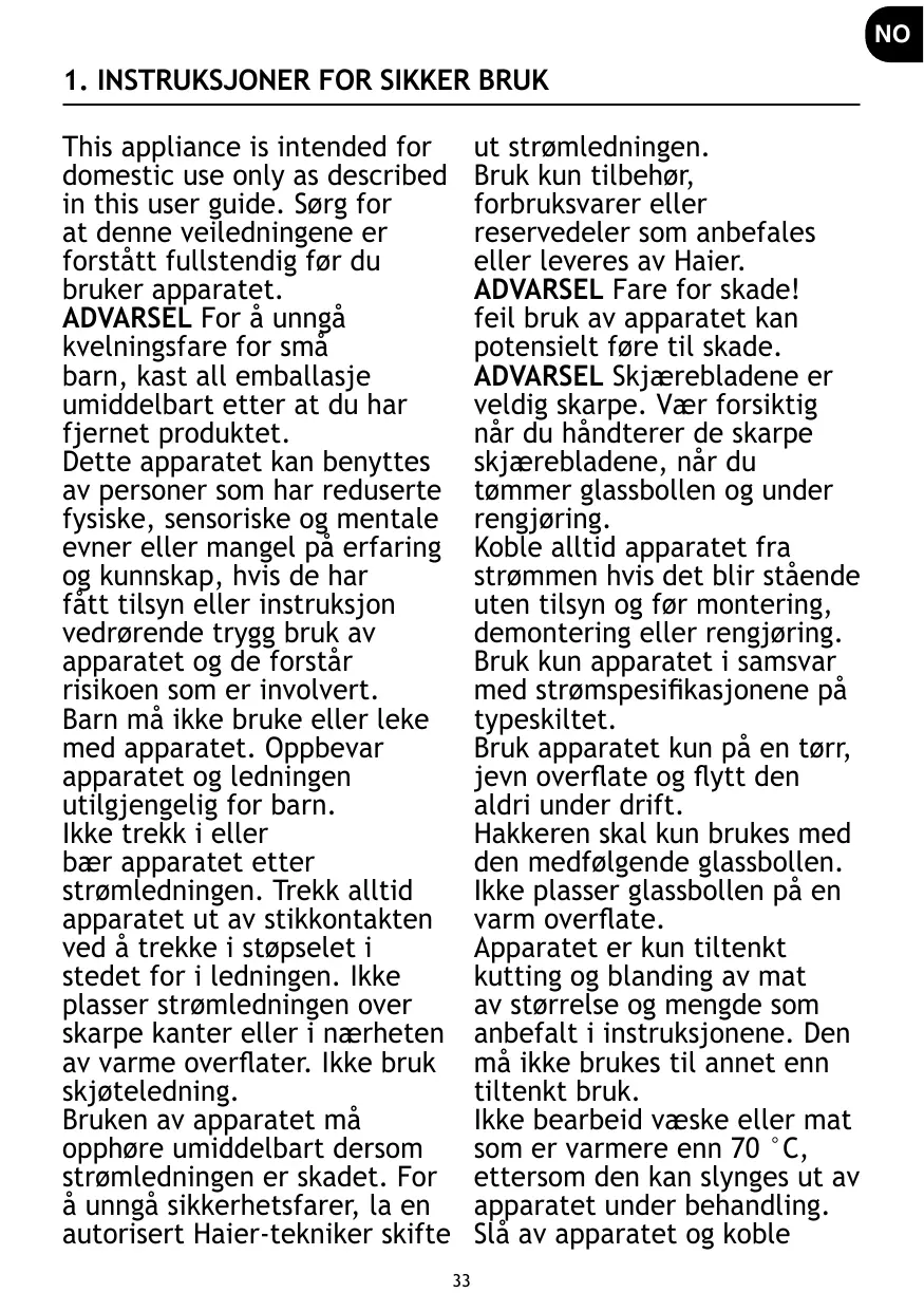 N’utilisez que les accessoires, les consommables et les pièces de rechange recommandés ou fournis par Haier. AVERTISSEMENT Risque de blessures ! Une mauvaise utilisation de l’appareil peut potentiellement entraîner des blessures. PRÉCAUTIONS Les lames de coupe sont très tranchantes ; faites attention lors de la manipulation des lames de coupe tranchantes, la vidange du bol en verre et le nettoyage. Débranchez toujours l’appareil s’il est laissé sans surveillance et avant de le monter, de le démonter ou de le nettoyer. N’utilisez l’appareil qu’en fonction de la puissance indiquée sur la fiche signalétique. N’utilisez l’appareil que sur une surface plane et sèche et ne le déplacez jamais lorsque vous travaillez. Le hacheur ne doit être utilisé qu’avec le bol en verre fourni. Ne placez pas le bol en verre sur une surface chaude. L’appareil est uniquement destiné à hacher ou à mélanger des aliments dont la taille et la quantité sont recommandées dans les consignes. Il ne doit pas être utilisé à d’autres fins que celles prévues. Ne traitez pas de liquide ou de nourriture plus chauds que 70°C 5