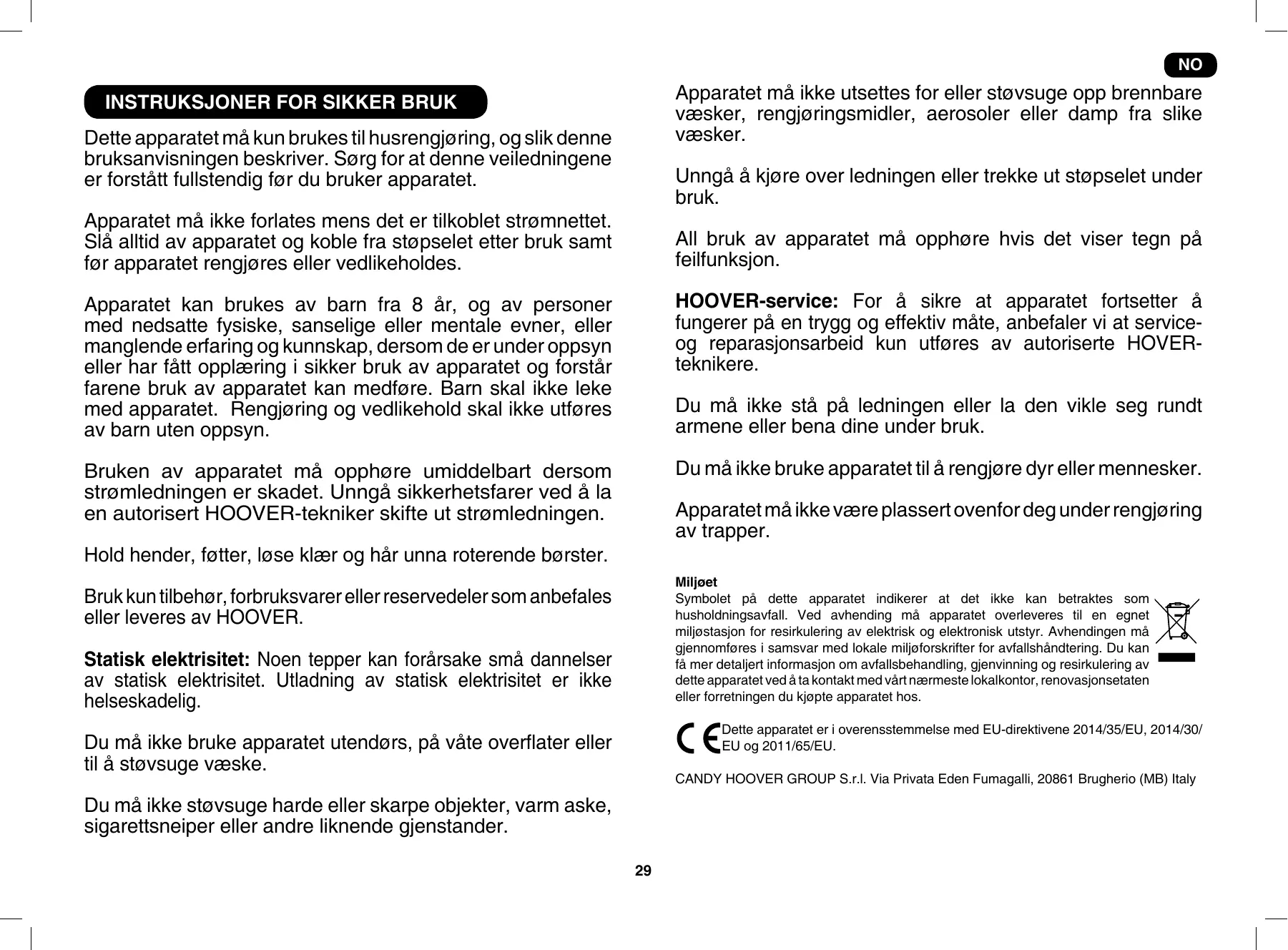 Le symbole figurant sur cet appareil indique qu’il ne peut pas être considéré comme une ordures ménagères. Vous devez le déposer dans un centre de recyclage des déchets électriques et électroniques. La déposition doit être effectuée conformément à la réglementation locale en matière de déchets. Pour obtenir des compléments d’information sur le traitement, la récupération et le recyclage de cet appareil, veuillez contacter votre municipalité, le service local d’élimination des ordures ménagères ou le revendeur de l’appareil. Cet appareil est conforme aux Directives européennes 2014/35/UE, 2014/30/UE et 2011/65/UE. CANDY HOOVER GROUP S.r.l. Via Privata Eden Fumagalli, 20861 Brugherio (MB) Italy