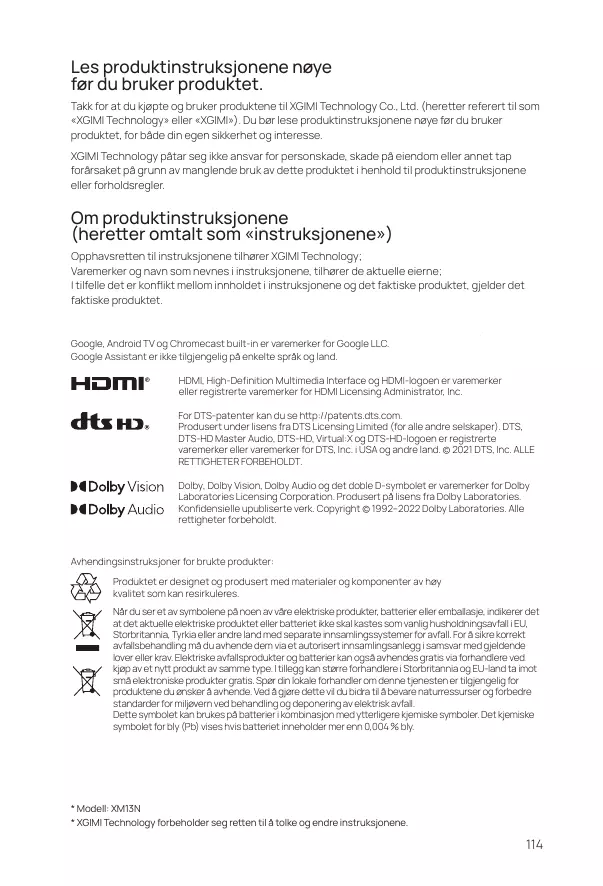 L'Assistant Google n'est pas disponible dans certaines langues et dans certains pays. L'interface multimédia haute définition HDMI et le logo HDMI sont des marques commerciales ou déposées de HDMI Licensing Administrator, Inc. Pour les brevets DTS, consultez le lien http://patents.dts.com. Fabriqué sous licence DTS Licensing Limited (pour toutes les autres entreprises). DTS, DTS-HD, Master Audio, DTS-HD, Virtual:X et le logo DTS-HD sont des marques déposées ou marques de fabrique de DTS, Inc. aux États-Unis et dans d'autres pays.© 2021 DTS, Inc. TOUS DROITS RÉSERVÉS. Dolby, Dolby Vision, Dolby Audio et le symbole double-D sont des marques déposées de Dolby Laboratories Licensing Corporation. Fabriqué sous licence de Dolby Laboratories. Travaux confidentiels non publiés. Copyright © 1992–2022 Dolby Laboratories. Tous droits réservés. Instructions pour l'élimination des produits usagés : Le produit est conçu et fabriqué avec des matériaux et des composants de haute qualité recyclables. La présence de l'un de ces symboles sur nos produits électriques, nos batteries ou nos emballages indique que le produit électrique ou la batterie en question ne doit pas être jeté comme les déchets ménagers ordinaires dans l'UE, le Royaume-Uni, en Türkiye ou dans d'autres pays disposant d'un système de collecte sélectif des déchets. Pour garantir un traitement correct des déchets, veuillez les jeter par l'intermédiaire d'un établissement de collecte autorisé, conformément aux lois et exigences applicables. Les produits électriques et les batteries usées peuvent également être jetés gratuitement par les détaillants lors de l'achat d'un nouveau produit du même type. En outre, au Royaume-Uni et dans les pays de l'UE, les grands détaillants peuvent accepter gratuitement les petits déchets électroniques. Veuillez demander à votre détaillant local si ce service est disponible pour les produits dont vous souhaitez vous débarrasser. Ainsi, vous contribuerez à préserver les ressources naturelles et à améliorer les normes de protection de l'environnement en matière de traitement et d'élimination des déchets électriques. Ce symbole peut être utilisé sur les batteries avec d'autres symboles chimiques. Le symbole chimique du plomb (Pb) apparaît si la batterie contient plus de 0,004 % de plomb.