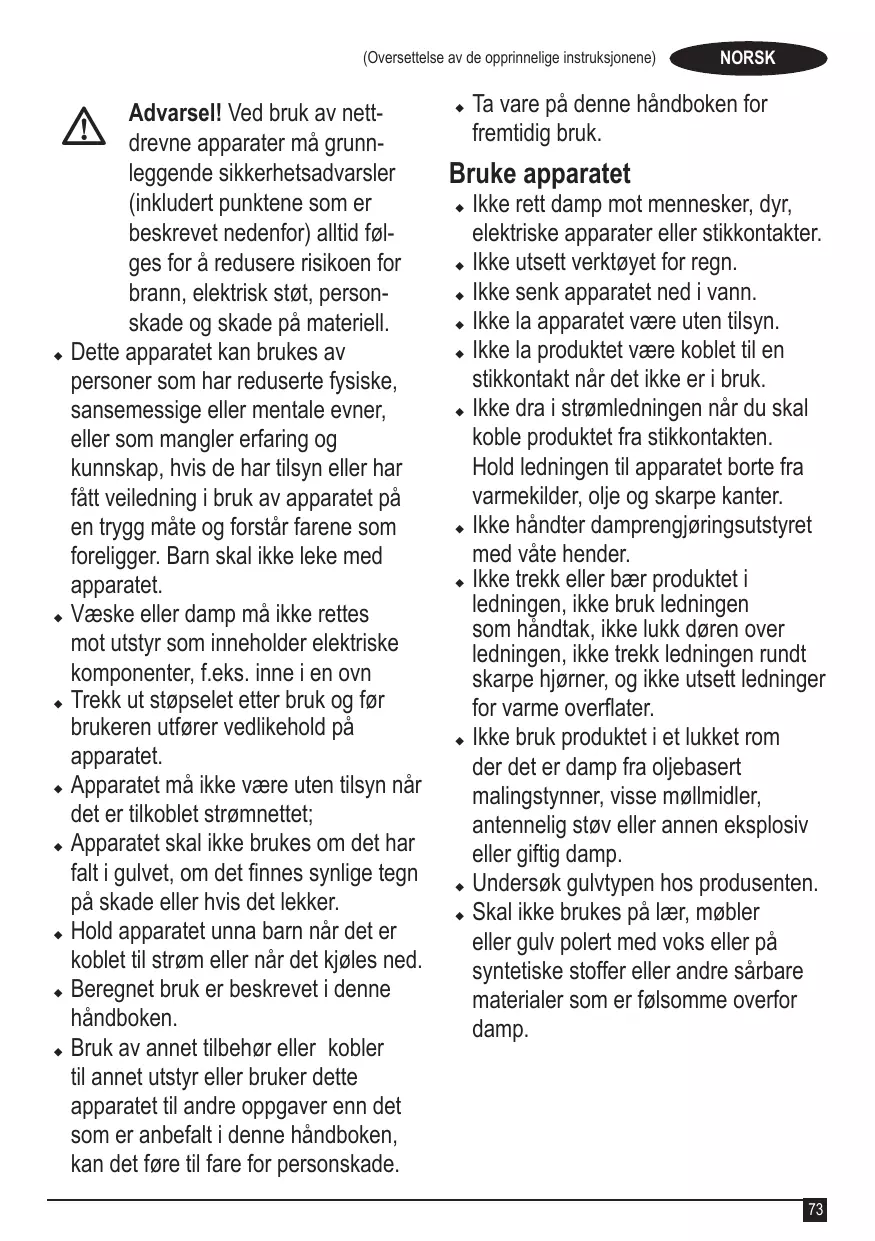 Advarsel! Ved bruk av nett@ drevne apparater må grunnleggende sikkerhetsadvarsler (inkludert punktene som er beskrevet nedenfor) alltid følges for å redusere risikoen for brann, elektrisk støt, personskade og skade på materiell. u Dette apparatet kan brukes av personer som har reduserte fysiske, sansemessige eller mentale evner, eller som mangler erfaring og kunnskap, hvis de har tilsyn eller har fått veiledning i bruk av apparatet på en trygg måte og forstår farene som foreligger. Barn skal ikke leke med apparatet. u Væske eller damp må ikke rettes mot utstyr som inneholder elektriske komponenter, f.eks. inne i en ovn u Trekk ut støpselet etter bruk og før brukeren utfører vedlikehold på apparatet. u Apparatet må ikke være uten tilsyn når det er tilkoblet strømnettet; u Apparatet skal ikke brukes om det har falt i gulvet, om det finnes synlige tegn på skade eller hvis det lekker. u Hold apparatet unna barn når det er koblet til strøm eller når det kjøles ned. u Beregnet bruk er beskrevet i denne håndboken. u Bruk av annet tilbehør eller kobler til annet utstyr eller bruker dette apparatet til andre oppgaver enn det som er anbefalt i denne håndboken, kan det føre til fare for personskade.
