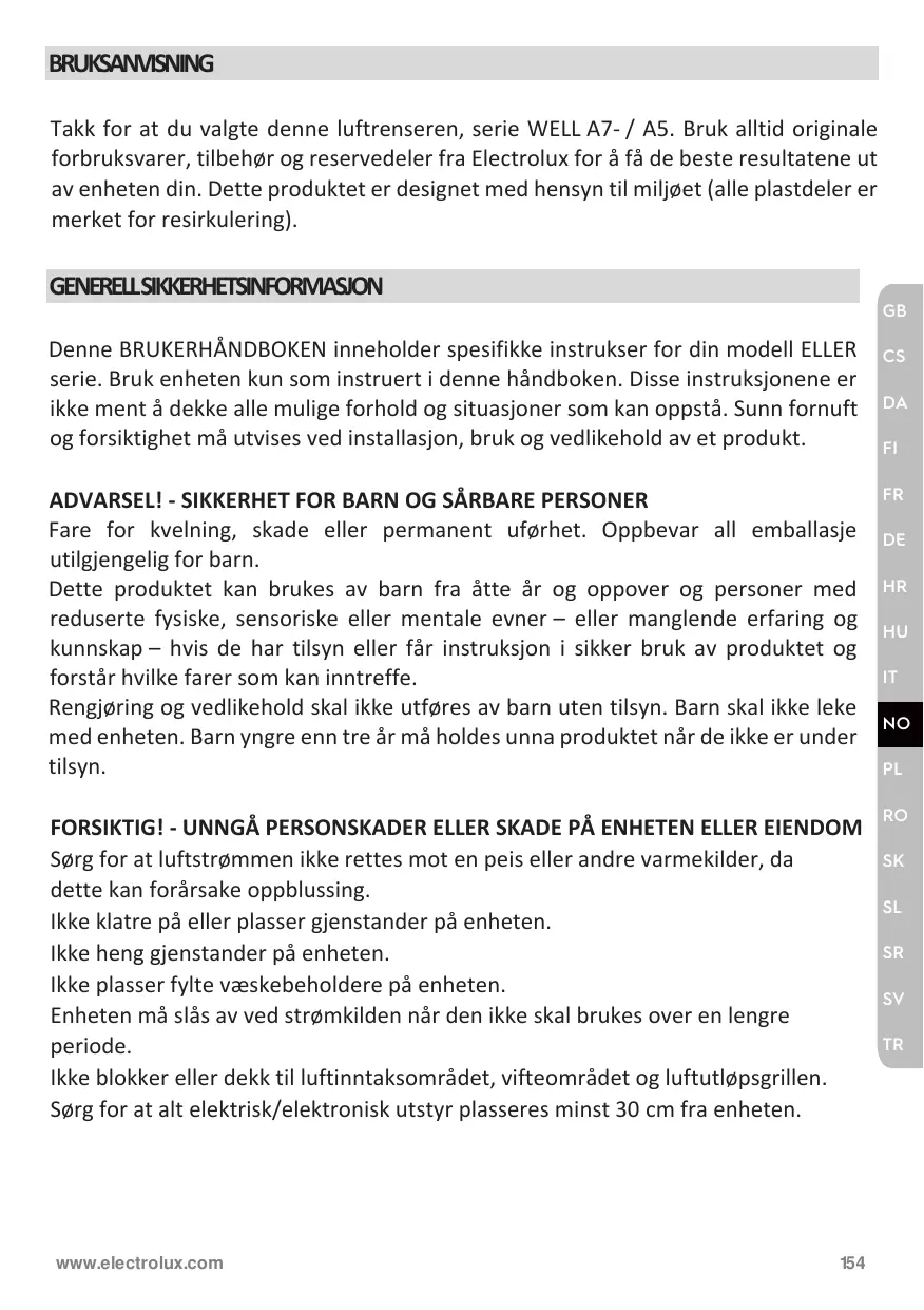 BRUKSANVISNING Takk for at du valgte denne luftrenseren, serie WELL A7- / A5. Bruk alltid originale forbruksvarer, tilbehør og reservedeler fra Electrolux for å få de beste resultatene ut av enheten din. Dette produktet er designet med hensyn til miljøet (alle plastdeler er merket for resirkulering).