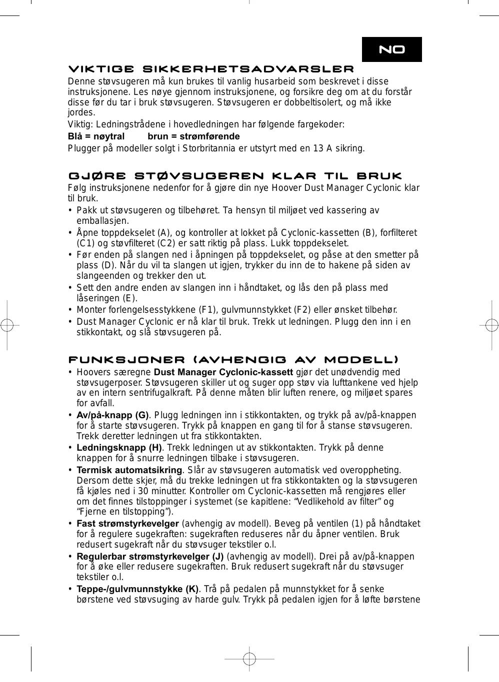 FUNKSJONER (AVHENGIG AV MODELL) • Hoovers særegne Dust Manager Cyclonic-kassett gjør det unødvendig med støvsugerposer. Støvsugeren skiller ut og suger opp støv via lufttankene ved hjelp av en intern sentrifugalkraft. På denne måten blir luften renere, og miljøet spares for avfall. • Av/på-knapp (G). Plugg ledningen inn i stikkontakten, og trykk på av/på-knappen for å starte støvsugeren. Trykk på knappen en gang til for å stanse støvsugeren. Trekk deretter ledningen ut fra stikkontakten. • Ledningsknapp (H). Trekk ledningen ut av stikkontakten. Trykk på denne knappen for å snurre ledningen tilbake i støvsugeren. • Termisk automatsikring. Slår av støvsugeren automatisk ved overoppheting. Dersom dette skjer, må du trekke ledningen ut fra stikkontakten og la støvsugeren få kjøles ned i 30 minutter. Kontroller om Cyclonic-kassetten må rengjøres eller om det finnes tilstoppinger i systemet (se kapitlene: “Vedlikehold av filter” og “Fjerne en tilstopping”). • Fast strømstyrkevelger (avhengig av modell). Beveg på ventilen (1) på håndtaket for å regulere sugekraften: sugekraften reduseres når du åpner ventilen. Bruk redusert sugekraft når du støvsuger tekstiler o.l. • Regulerbar strømstyrkevelger (J) (avhengig av modell). Drei på av/på-knappen for å øke eller redusere sugekraften. Bruk redusert sugekraft når du støvsuger tekstiler o.l. • Teppe-/gulvmunnstykke (K). Trå på pedalen på munnstykket for å senke børstene ved støvsuging av harde gulv. Trykk på pedalen igjen for å løfte børstene