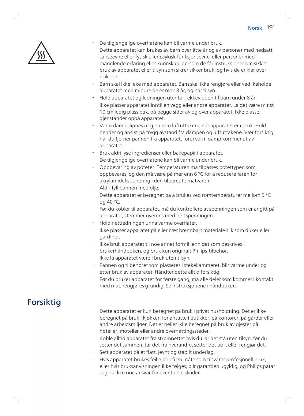 - S'il est employé de manière inappropriée, à des fins professionnelles ou semiprofessionnelles, ou en non-conformité avec les instructions du mode d'emploi, la garantie devient caduque et Philips décline toute responsabilité concernant les dégâts occasionnés. Confiez toujours l'appareil à un Centre Service Agréé Philips pour vérification ou réparation. N'essayez jamais de réparer l'appareil vous-même ; toute intervention indue entraîne l'annulation de la garantie. Débranchez toujours l'appareil après utilisation. Laissez l'appareil refroidir pendant environ 30 minutes avant de le nettoyer ou de le manipuler. Assurez-vous que les aliments cuits dans cet appareil sont dorés et non bruns ou noirs. Enlevez les résidus brûlés. Ne faites pas frire de pommes de terre fraîches à une température supérieure à 180 °C (pour limiter la création d'acrylamide). Faites preuve de prudence lorsque vous nettoyez la partie supérieure de la chambre de cuisson : la résistance, le bord des pièces métalliques et l'écran protecteur sont brûlants. Assurez-vous toujours que les aliments sont parfaitement cuits dans l'Airfryer. Faites preuve de prudence lorsque vous versez les aliments cuits et veillez à ne pas laisser tomber les accessoires.