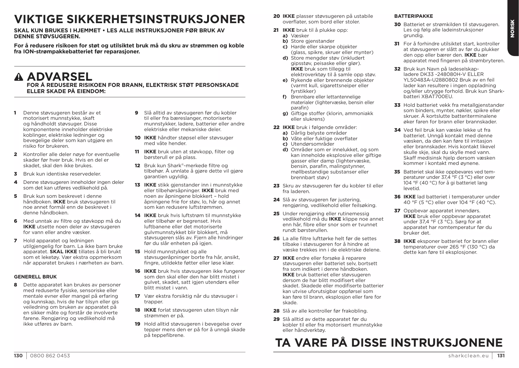 IKKE bruk uten at støvkopp, filter og børsterull er på plass. 12 Bruk kun Shark®-merkede filtre og tilbehør. Å unnlate å gjøre dette vil gjøre garantien ugyldig. 13 IKKE stikk gjenstander inn i munnstykke eller tilbehørsåpninger. IKKE bruk med noen av åpningene blokkert – hold åpningene frie for støv, lo, hår og annet som kan redusere luftstrømmen. 14 IKKE bruk hvis luftstrøm til munnstykke eller tilbehør er begrenset. Hvis luftbanene eller det motoriserte gulvmunnstykket blir blokkert, må støvsugeren slås av. Fjern alle hindringer før du slår enheten på igjen. 15 Hold munnstykket og alle støvsugeråpninger borte fra hår, ansikt, fingre, utildekte føtter eller løse klær. 16 IKKE bruk hvis støvsugeren ikke fungerer som den skal eller den har blitt mistet i gulvet, skadet, satt igjen utendørs eller blitt mistet i vann. 17 Vær ekstra forsiktig når du støvsuger i trapper. 18 IKKE forlat støvsugeren uten tilsyn når strømmen er på. 19 Hold alltid støvsugeren i bevegelse over tepper mens den er på for å unngå skade på teppefibrene. 20 IKKE plasser støvsugeren på ustabile overflater, som bord eller stoler. 21 IKKE bruk til å plukke opp: a) Væsker b) Store gjenstander c) Harde eller skarpe objekter (glass, spikre, skruer eller mynter) d) Store mengder støv (inkludert gipsstøv, peisaske eller glør). IKKE bruk som tillegg til elektroverktøy til å samle opp støv. e) Rykende eller brennende objekter (varmt kull, sigarettsneiper eller fyrstikker) f) Brennbare eller lettantennelige materialer (lightervæske, bensin eller parafin) g) Giftige stoffer (klorin, ammoniakk eller slukrens) 22 IKKE bruk i følgende områder: a) Dårlig belyste områder b) Våte eller fuktige overflater c) Utendørsområder d) Områder som er innelukket, og som kan inneholde eksplosive eller giftige gasser eller damp (lightervæske, bensin, parafin, malingstynner, møllbestandige substanser eller brennbart støv) 23 Skru av støvsugeren før du kobler til eller fra laderen. 24 Slå av støvsugeren før justering, rengjøring, vedlikehold eller feilsøking. 25 Under rengjøring eller rutinemessig vedlikehold må du IKKE klippe noe annet enn hår, fibre eller snor som er tvunnet rundt børsterullen. 26 La alle filtre lufttørke helt før de settes tilbake i støvsugeren for å hindre at væske trekkes inn i de elektriske delene. 27 IKKE endre eller forsøke å reparere støvsugeren eller batteriet selv, bortsett fra som indikert i denne håndboken. IKKE bruk batteriet eller støvsugeren dersom de har blitt modifisert eller skadet. Skadede eller modifiserte batterier kan utvise uforutsigbar oppførsel som kan føre til brann, eksplosjon eller fare for skade. BATTERIPAKKE 30 Batteriet er strømkilden til støvsugeren. Les og følg alle ladeinstruksjoner grundig. 31 For å forhindre utilsiktet start, kontroller at støvsugeren er slått av før du plukker den opp eller bærer den. IKKE bær apparatet med fingeren på strømbryteren. 32 Bruk kun Navn på ladeselskapladere DK33 -248080H-V ELLER YLS0483A-U2880802 Bruk av en feil lader kan resultere i ingen oppladning og/eller utrygge forhold. Bruk kun Sharkbatteri XBAT700EU. 33 Hold batteriet vekk fra metallgjenstander som binders, mynter, nøkler, spikre eller skruer. Å kortslutte batteriterminalene øker faren for brann eller brannskader. 34 Ved feil bruk kan væske lekke ut fra batteriet. Unngå kontakt med denne væsken, da den kan føre til irritasjon eller brannskader. Hvis kontakt likevel skulle skje, skal du skylle med vann. Skaff medisinsk hjelp dersom væsken kommer i kontakt med øynene. 35 Batteriet skal ikke oppbevares ved temperaturer under 37,4 °F (3 °C) eller over 104 °F (40 °C) for å gi batteriet lang levetid. 36 IKKE lad batteriet i temperaturer under 40 °F (5 °C) eller over 104 °F (40 °C). 37 Oppbevar apparatet innendørs. IKKE bruk eller oppbevar apparatet under 37,4 °F (3 °C). Sørg for at apparatet har romtemperatur før du bruker det. 38 IKKE eksponer batteriet for brann eller temperaturer over 265 °F (130 °C) da dette kan føre til eksplosjoner. 28 Slå av alle kontroller før frakobling. 29 Slå alltid av dette apparatet før du kobler til eller fra motorisert munnstykke eller håndverktøy.