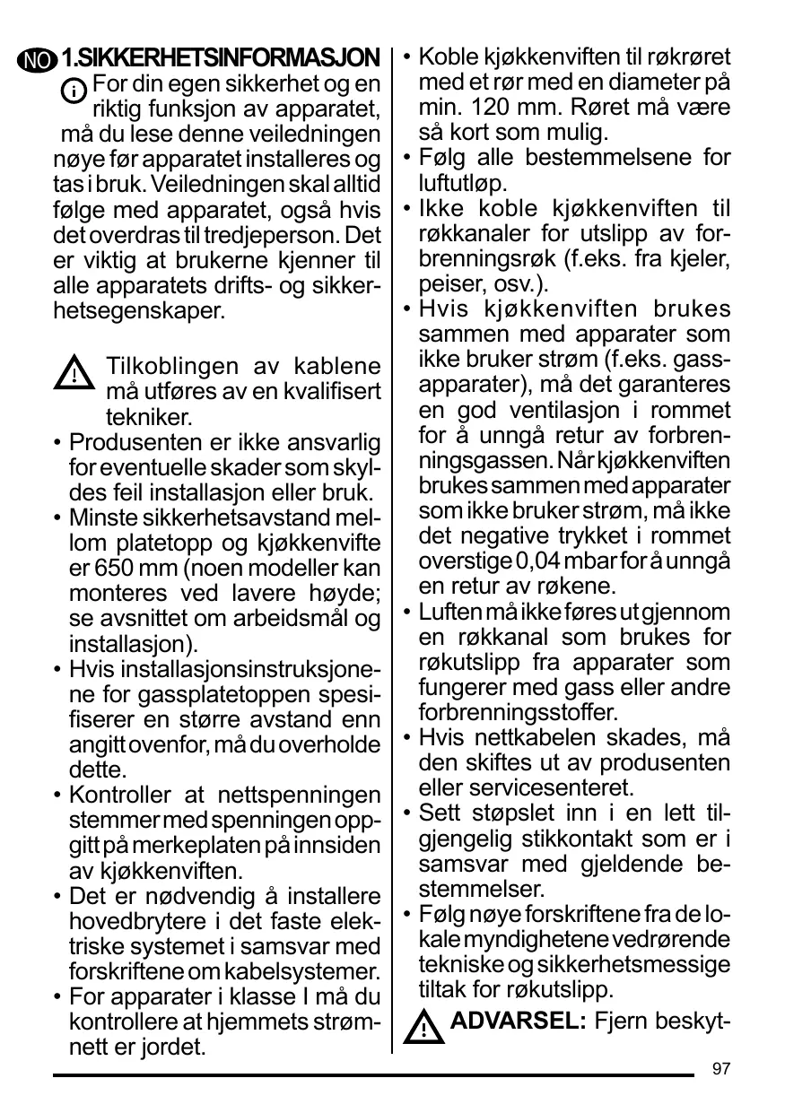 med et rør med en diameter på For din egen sikkerhet og en min. 120 mm. Røret må være riktig funksjon av apparatet, så kort som mulig. må du lese denne veiledningen nøye før apparatet installeres og • Følg alle bestemmelsene for luftutløp. tas i bruk. Veiledningen skal alltid • Ikke koble kjøkkenviften til følge med apparatet, også hvis røkkanaler for utslipp av fordet overdras til tredjeperson. Det brenningsrøk (f.eks. fra kjeler, er viktig at brukerne kjenner til peiser, osv.). alle apparatets drifts- og sikker• Hvis kjøkkenviften brukes hetsegenskaper. sammen med apparater som ikke bruker strøm (f.eks. gassTilkoblingen av kablene apparater), må det garanteres må utføres av en kvalifisert en god ventilasjon i rommet tekniker. for å unngå retur av forbren• Produsenten er ikke ansvarlig ningsgassen. Når kjøkkenviften for eventuelle skader som skylbrukes sammen med apparater des feil installasjon eller bruk. som ikke bruker strøm, må ikke • Minste sikkerhetsavstand meldet negative trykket i rommet lom platetopp og kjøkkenvifte overstige 0,04 mbar for å unngå er 650 mm (noen modeller kan en retur av røkene. monteres ved lavere høyde; Luften må ikke føres ut gjennom • se avsnittet om arbeidsmål og en røkkanal som brukes for installasjon). røkutslipp fra apparater som • Hvis installasjonsinstruksjonefungerer med gass eller andre ne for gassplatetoppen spesiforbrenningsstoffer. fiserer en større avstand enn Hvis nettkabelen skades, må • angitt ovenfor, må du overholde den skiftes ut av produsenten dette. eller servicesenteret. • Kontroller at nettspenningen • Sett støpslet inn i en lett tilstemmer med spenningen oppgjengelig stikkontakt som er i gitt på merkeplaten på innsiden samsvar med gjeldende beav kjøkkenviften. stemmelser. • Det er nødvendig å installere Følg nøye forskriftene fra de lo• hovedbrytere i det faste elekkale myndighetene vedrørende triske systemet i samsvar med tekniske og sikkerhetsmessige forskriftene om kabelsystemer. tiltak for røkutslipp. • For apparater i klasse I må du ADVARSEL: Fjern beskytkontrollere at hjemmets strømnett er jordet. 97