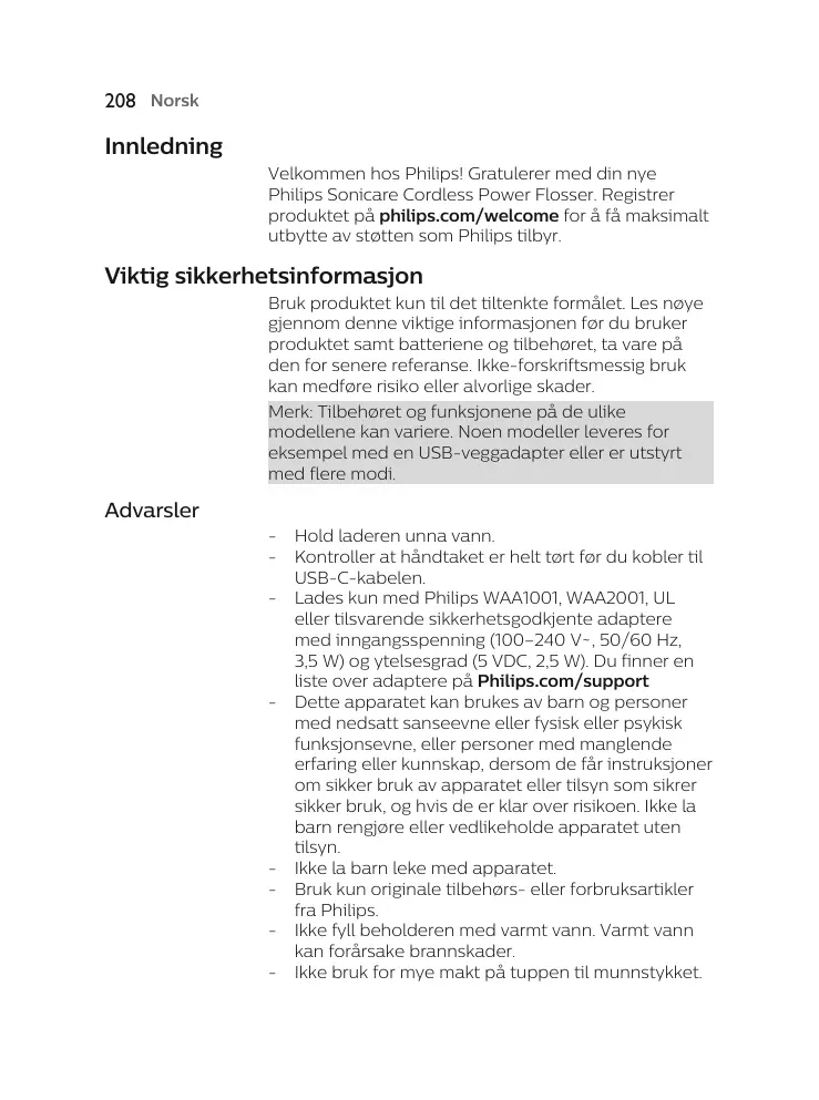 Hold laderen unna vann. Kontroller at håndtaket er helt tørt før du kobler til USB-C-kabelen. Lades kun med Philips WAA1001, WAA2001, UL eller tilsvarende sikkerhetsgodkjente adaptere med inngangsspenning (100–240 V~, 50/60 Hz, 3,5 W) og ytelsesgrad (5 VDC, 2,5 W). Du finner en liste over adaptere på Philips.com/support Dette apparatet kan brukes av barn og personer med nedsatt sanseevne eller fysisk eller psykisk funksjonsevne, eller personer med manglende erfaring eller kunnskap, dersom de får instruksjoner om sikker bruk av apparatet eller tilsyn som sikrer sikker bruk, og hvis de er klar over risikoen. Ikke la barn rengjøre eller vedlikeholde apparatet uten tilsyn. Ikke la barn leke med apparatet. Bruk kun originale tilbehørs- eller forbruksartikler fra Philips. Ikke fyll beholderen med varmt vann. Varmt vann kan forårsake brannskader. Ikke bruk for mye makt på tuppen til munnstykket.