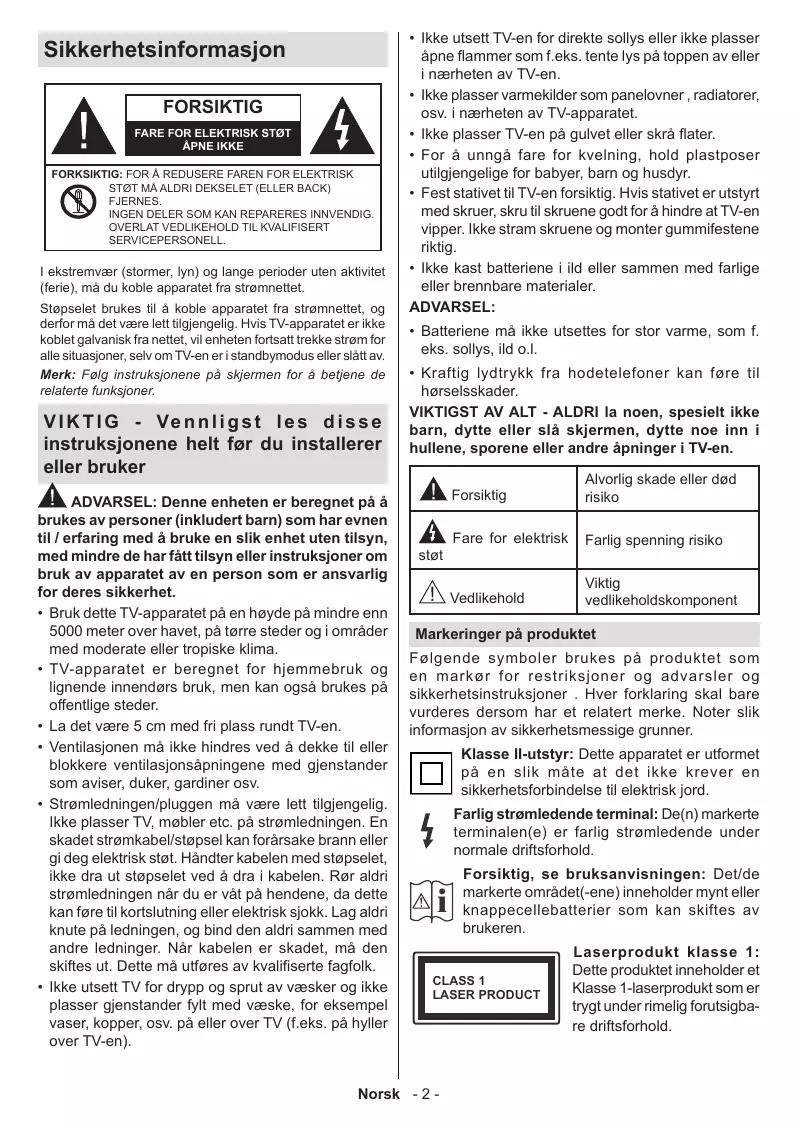 V I K T I G - Ve n n l i g s t l e s d i s s e instruksjonene helt før du installerer eller bruker ADVARSEL: Denne enheten er beregnet på å brukes av personer (inkludert barn) som har evnen til / erfaring med å bruke en slik enhet uten tilsyn, med mindre de har fått tilsyn eller instruksjoner om bruk av apparatet av en person som er ansvarlig for deres sikkerhet. • Bruk dette TV-apparatet på en høyde på mindre enn 5000 meter over havet, på tørre steder og i områder med moderate eller tropiske klima. • TV-apparatet er beregnet for hjemmebruk og lignende innendørs bruk, men kan også brukes på offentlige steder. • La det være 5 cm med fri plass rundt TV-en. • Ventilasjonen må ikke hindres ved å dekke til eller blokkere ventilasjonsåpningene med gjenstander som aviser, duker, gardiner osv. • Strømledningen/pluggen må være lett tilgjengelig. Ikke plasser TV, møbler etc. på strømledningen. En skadet strømkabel/støpsel kan forårsake brann eller gi deg elektrisk støt. Håndter kabelen med støpselet, ikke dra ut støpselet ved å dra i kabelen. Rør aldri strømledningen når du er våt på hendene, da dette kan føre til kortslutning eller elektrisk sjokk. Lag aldri knute på ledningen, og bind den aldri sammen med andre ledninger. Når kabelen er skadet, må den skiftes ut. Dette må utføres av kvalifiserte fagfolk. • Ikke utsett TV for drypp og sprut av væsker og ikke plasser gjenstander fylt med væske, for eksempel vaser, kopper, osv. på eller over TV (f.eks. på hyller over TV-en).