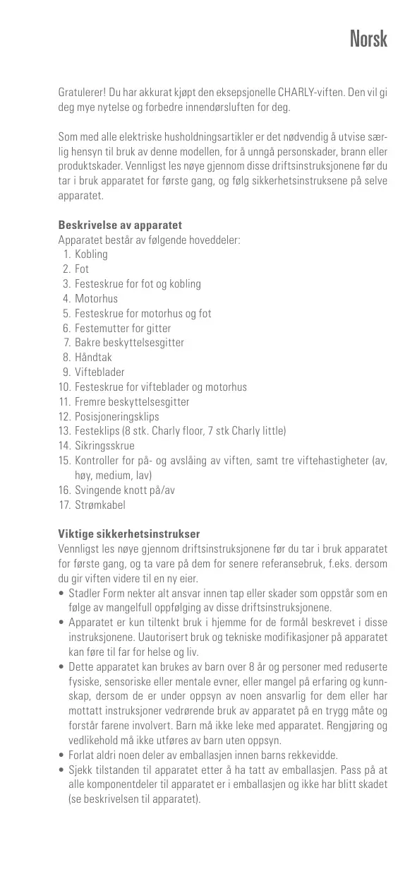 Vennligst les nœyège gjennom driftsinstruksjönene før du tar i bruk apparatet for Förste gang, og ta vare pà dem for senere referansebruk, f.eks. dersom du gir viften videre til en ny eier.