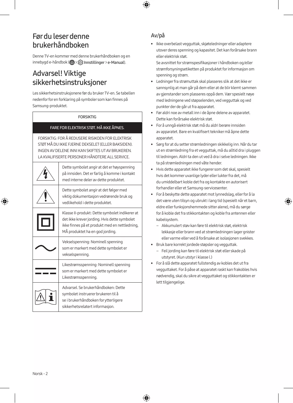 - • Ikke overbelast vegguttak, skjøteledninger eller adaptere utover deres spenning og kapasitet. Det kan forårsake brann Denne TV-en kommer med denne brukerhåndboken og en eller elektrisk støt. innebygd e-håndbok ( Se avsnittet for strømspesifikasjoner i håndboken og/eller