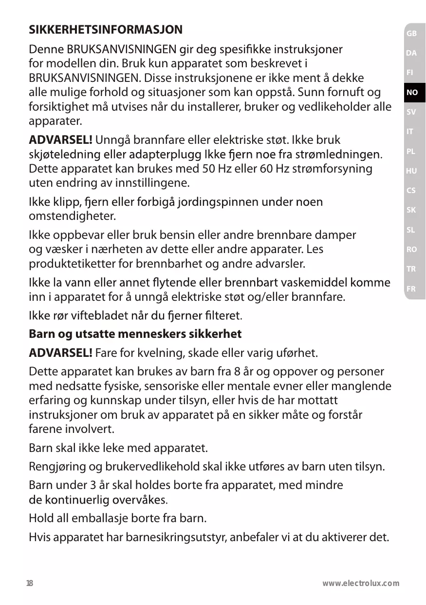 électrique. N'utilisez pas de rallonge ni de prise adaptateur. Ne retirez pas de broche du câble d'alimentation. Cet appareil peut être utilisé avec une alimentation électrique de 50 Hz ou 60 Hz sans être modifié. Il ne faut en aucun cas couper, enlever ou contourner la pince de mise à la terre. Ne stockez ou n'utilisez pas d'essence ou d'autres liquides ou vapeurs inflammables à proximité de cet appareil ou de tout autre appareil. Lisez les étiquettes produit relatives à la combustibilité ainsi que tous les autres avertissements. Ne laissez pas d’eau ou de détergent liquide ou inflammable entrer dans l’appareil pour éviter un choc électrique et/ou un risque d’incendie. Ne touchez pas la pale du ventilateur en retirant le filtre. Sécurité des enfants et des personnes vulnérables AVERTISSEMENT ! Risque d'asphyxie, de blessure ou d'invalidité permanente. Cet appareil peut être utilisé par des enfants à partir de 8 ans et par des personnes ayant des capacités physiques, sensorielles ou mentales réduites ou un manque d'expérience et de connaissances à condition d'être surveillées, d'avoir reçu des instructions concernant l'utilisation de l'appareil en toute sécurité et de comprendre les dangers encourus. Les enfants ne doivent pas jouer avec cet appareil. Les enfants ne doivent pas nettoyer ni entreprendre une opération de maintenance sur l'appareil sans surveillance. Les enfants de moins de 3 ans doivent être tenus à l'écart de l'appareil, à moins d'être surveillés en permanence. Ne laissez pas les emballages à portée de main des enfants. Si l’appareil dispose d’un dispositif de sécurité pour enfants, nous vous recommandons de l’activer. 58