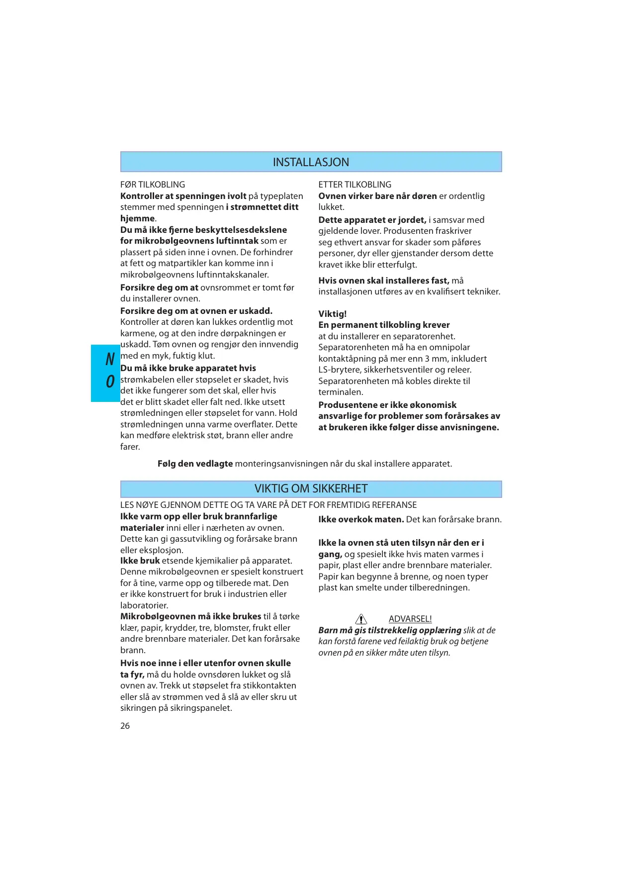 Barn migis tilstrekkelig opplaerng sik at de kan forsta farene ved feilaktig bruk og betjene ovn pa en sikker mate uten tilsyn.