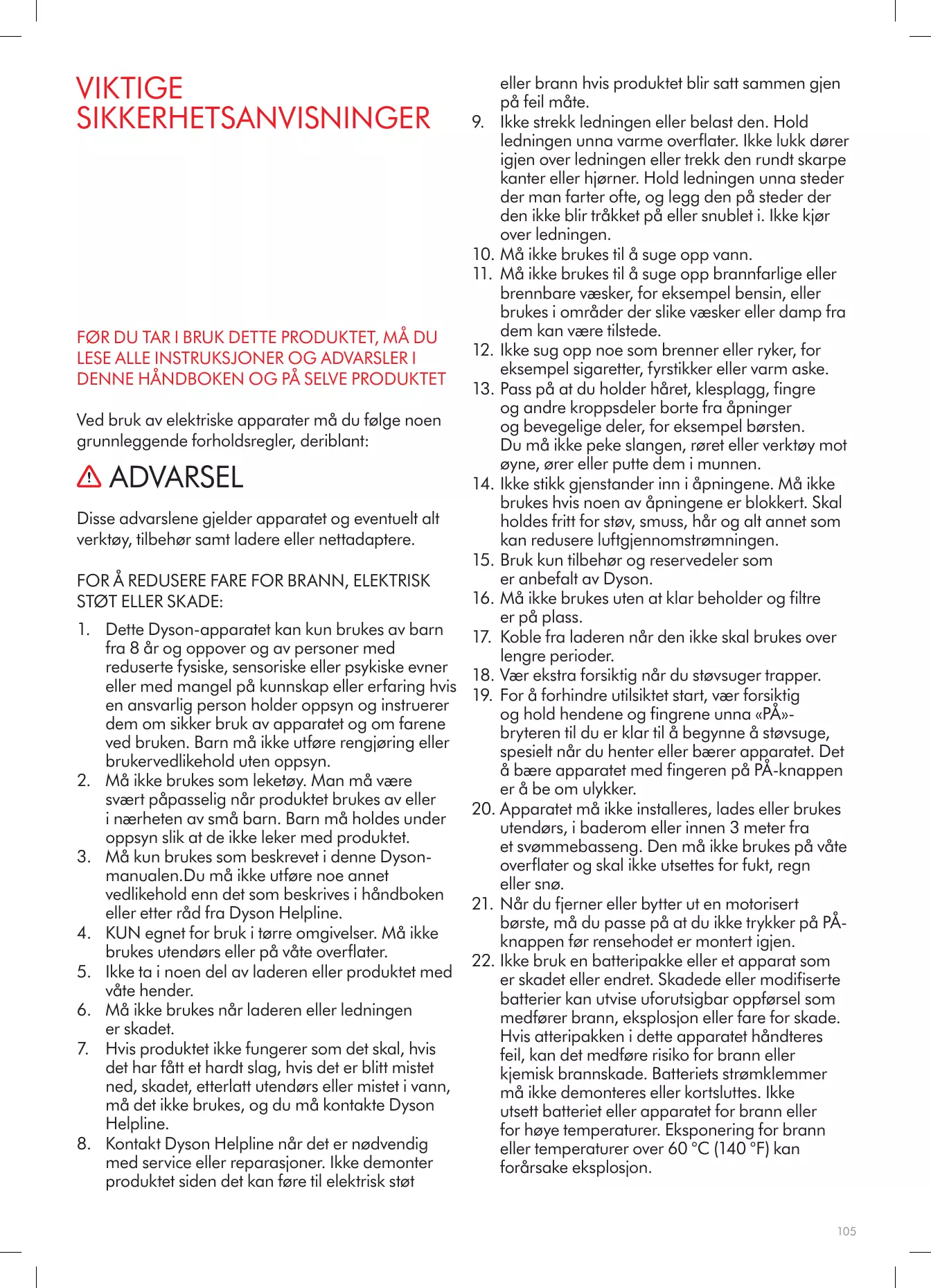 LISEZ ATTENTIVEMENT CES CONSIGNES ET CONSERVEZ-LES Cet appareil Dyson est exclusivement destiné à un usage domestique.