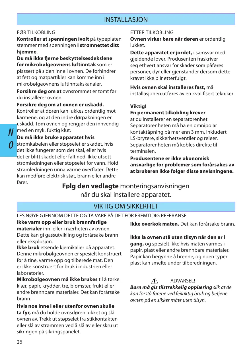 ADVARSEL! Mikrobølgeovnen må ikke brukes til å varme opp noe som ligger i lufttette beholdere. Dette øker trykket og kan føre til at beholderen eksploderer eller at det koker over når du åpner lokket. ADVARSEL! Dørpakningene og områdene rundt bør sjekkes jevnlig for skader. Dersom disse områdene er skadet, må du ikke bruke ovnen før den er reparert av en kvalifisert servicetekniker. EGG Ikke bruk mikrøbølgeovnen til å koke eller varme opp hele egg, verken med eller uten skall, da de lett kan eksplodere, selv etter at oppvarmingen er avsluttet. FORHOLDSREGLER GENERELT Dette apparatet er bare laget for bruk i hjemmet! Apparatet må ikke brukes med mikrobølger dersom det ikke er mat i ovnen. Ved slik bruk kan apparatet skades. Hvis du vil øve deg på å bruke mikrobølgeovnen, kan du sette et glass med vann i ovnen. Vannet vil oppta mikrobølgeenergien, og ovnen vil ikke bli skadd. Ikke bruk ovnsrommet som oppbevaringsrom. Du må ikke fjerne beskyttelsesdekslene for mikrobølgeovnens luftinntak som er plassert på siden inne i ovnen. De forhindrer at fett og matpartikler kan komme inn i mikrobølgeovnens luftinntakskanaler. Klemmer eller annet som inneholder metalltråder kan gi gnistutvikling i ovnen, og må derfor fjernes fra poser og lignende før dette settes inn i ovnen. FRITYRSTEKING Ikke bruk mikrobølgeovnen til frityrsteking, siden du ikke kan kontrollere temperaturen på oljen. Bruk grytekluter eller lignende for å unngå forbrenning når du berører beholdere, ovnsdeler og pannen etter tilberedning. VÆSKER F.eks. drikke eller vann i mikrobølgeovnen kan nå kokepunktet uten at det er noen synlige bobler. Denne såkalte kokeforsinkelsen kan forårsake at når du tar beholderen ut av ovnen, kan væsken koke over og gi brannskader. For å unngå dette, bør du følge denne fremgangsmåten: