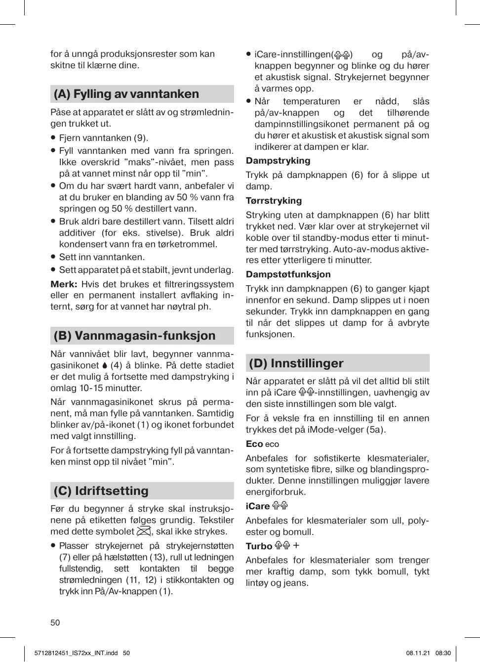 Lorsque l’appareil est mis en marche, il est toujours réglé selon le réglage iCare , indépendamment du dernier réglage choisi. Pour passer d’un réglage à un autre, appuyez sur le bouton sélecteur iMode (5a). Eco Ce réglage est recommandé pour les tissus les plus délicats tels que les tissus synthétiques, la soie ou les tissus métissés. Ce réglage permet de réduire la consommation d’énergie.