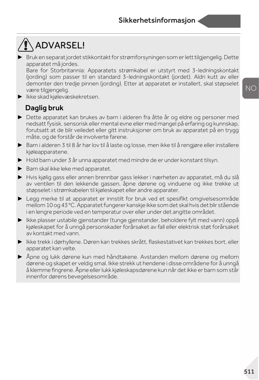► Cet appareil peut être utilisé par des enfants à partir de 8 ans et par des personnes ayant des capacités physiques, sensorielles ou mentales réduites ou un manque d’expérience et de connaissances, s’ils sont sous surveillance ou si on leur a appris à utiliser l’appareil en toute sécurité et s’ils comprennent les risques courus. ► Les enfants âgés de 3 à 8 ans sont autorisés à remplir et vider les appareils de réfrigération, mais ne sont pas autorisés à les nettoyer ni à les installer. ► Gardez les enfants âgés de moins de 3 ans à l’écart de l’appareil à moins qu’ils ne soient constamment surveillés. ► Les enfants ne doivent pas jouer avec l’appareil. ► Si du gaz réfrigérant ou tout autre gaz inflammable fuit à proximité de l’appareil, fermez la vanne du gaz qui fuit, ouvrez les portes et les fenêtres et ne débranchez pas le câble d’alimentation du réfrigérateur ou de tout autre appareil. ► Notez que l’appareil est conçu pour fonctionner dans une plage de température ambiante spécifique comprise entre 10 °C et 43 °C. L’appareil peut ne pas fonctionner correctement s’il est laissé pendant une longue période à une température inférieure ou supérieure à la plage indiquée. ► Ne placez pas d’objets instables (objets lourds, récipients remplis d’eau) sur le dessus du réfrigérateur, pour éviter les blessures corporelles causées par une chute ou une électrocution causée par le contact avec de l’eau. ► Ne tirez pas sur les balconnets. La porte peut être tirée en biais, le porte-bouteilles peut être retiré ou l’appareil risque de basculer. ► Ouvrez et fermez les portes uniquement avec les poignées. L’écart entre les portes et entre les portes et le compartiment est très étroit. Ne mettez pas vos mains dans ces zones pour éviter de vous pincer les doigts. Ouvrez ou fermez les portes du réfrigérateur uniquement lorsqu’il n’y a pas d’enfants dans le rayon de mouvement de la porte.