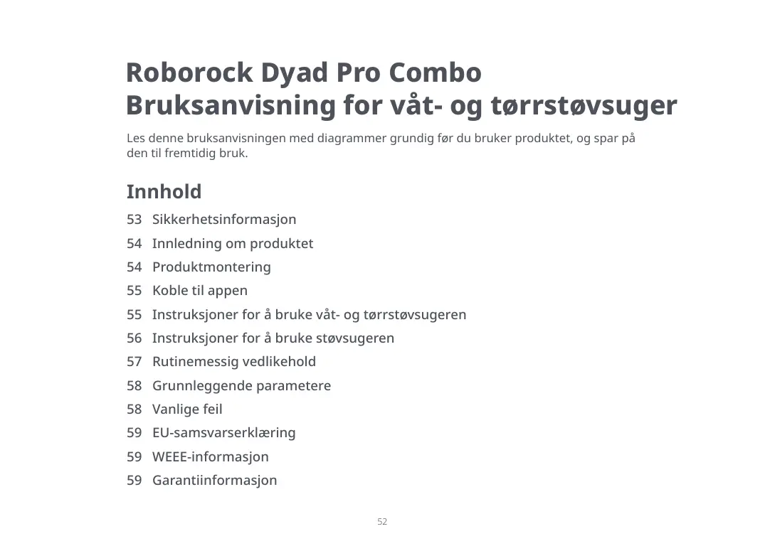 Roborock Dyad Pro Combo Bruksanvisning for våt- og tørrstøvsuger Les denne bruksanvisningen med diagrammer grundig før du bruker produktet, og spar på den til fremtidig bruk. Innhold 53 Sikkerhetsinformasjon 54 Innledning om produktet 54 Produktmontering 55 Koble til appen 55 Instruksjoner for å bruke våt- og tørrstøvsugeren 56 Instruksjoner for å bruke støvsugeren 57 Rutinemessig vedlikehold 58 Grunnleggende parametere 58 Vanlige feil 59 EU-samsvarserklæring 59 WEEE-informasjon 59 Garantiinformasjon