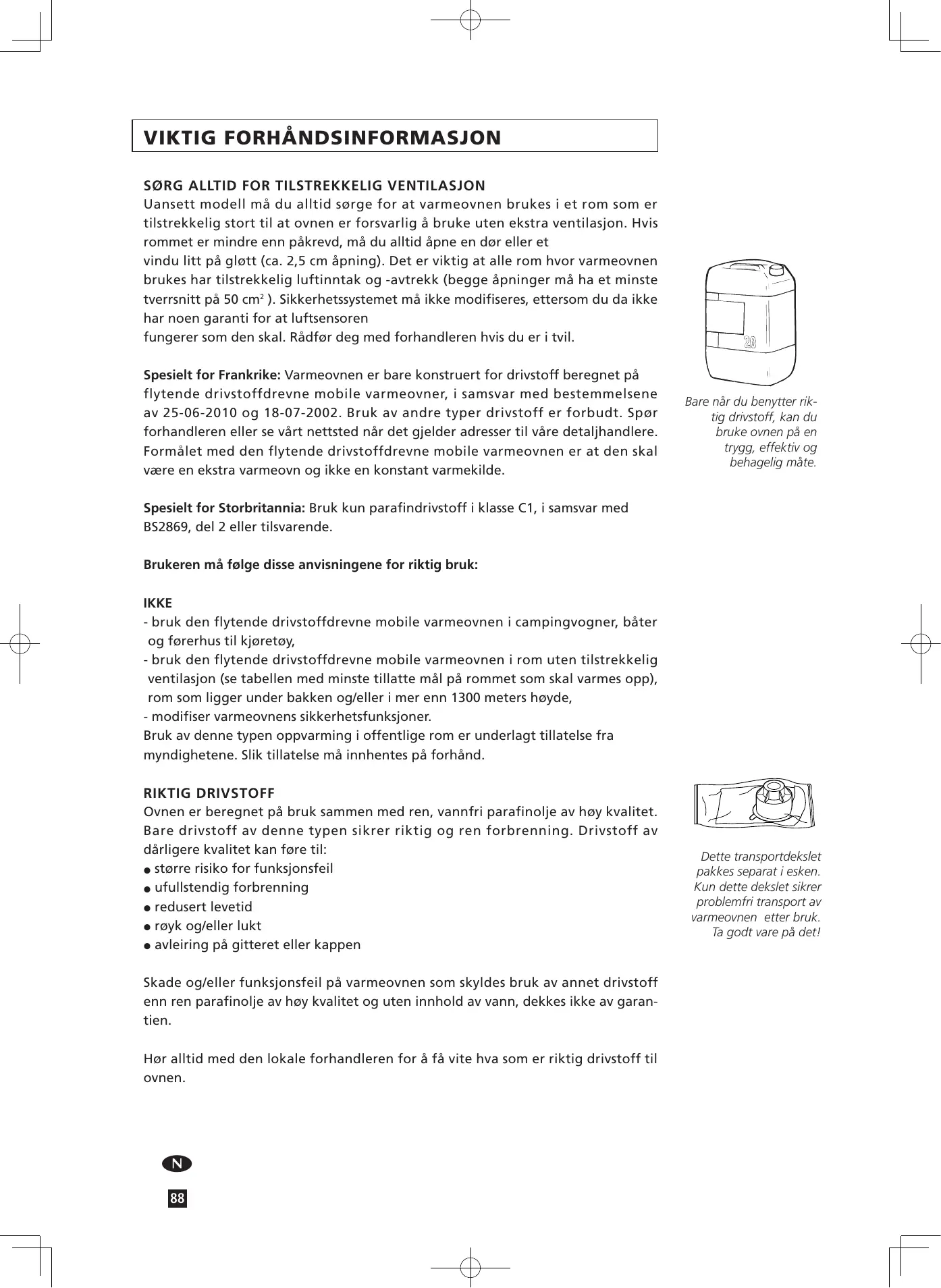 • Dans tous les cas, l’utilisateur doit vérifier la bonne fermeture de son réservoir rechargé en dehors de toute source de chaleur ou de feux nus (voir le chapitre B). Votre appareil dégagera une odeur de ‘neuf’ en chauffant pour la première fois. Conservez votre combustible dans un endroit frais, à l’abri de la lumière après avoir fermé le ou les bidons avec le bouchon d’origine. Le combustible vieillit. Utilisez à chaque début de saison de chauffage du nouveau combustible. Utilisez uniquement paraffine de haute qualité, sans eau et pur conformément à la législation locale. Si vous changez de marque et/ou de type de combustible, vous devez d’abord vous assurer que l’appareil mobile de chauffage à combustible liquide consomme entièrement le combustible présent.