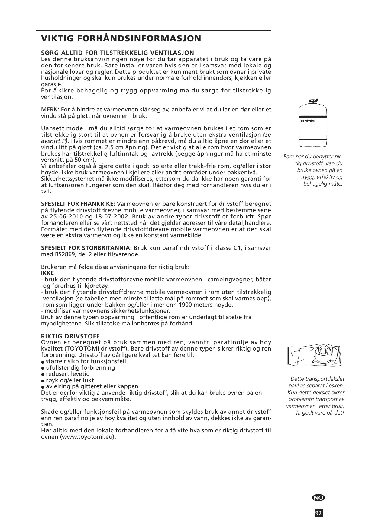 • Dans tous les cas, l’utilisateur doit vérifier la bonne fermeture de son réservoir rechargé en dehors de toute source de chaleur ou de feux nus (voir le chapitre B). Votre appareil dégagera une odeur de ‘neuf’ en chauffant pour la première fois. Conservez votre combustible dans un endroit frais, à l’abri de la lumière après avoir fermé le ou les bidons avec le bouchon d’origine. Le combustible vieillit. Utilisez à chaque début de saison de chauffage du nouveau combustible. Utilisez uniquement paraffine de haute qualité, sans eau et pur conformément à la législation locale (TOYOTOMI combustible). Si vous changez de marque et/ou de type de combustible, vous devez d’abord vous assurer que l’appareil mobile de chauffage à combustible liquide consomme entièrement le combustible présent.