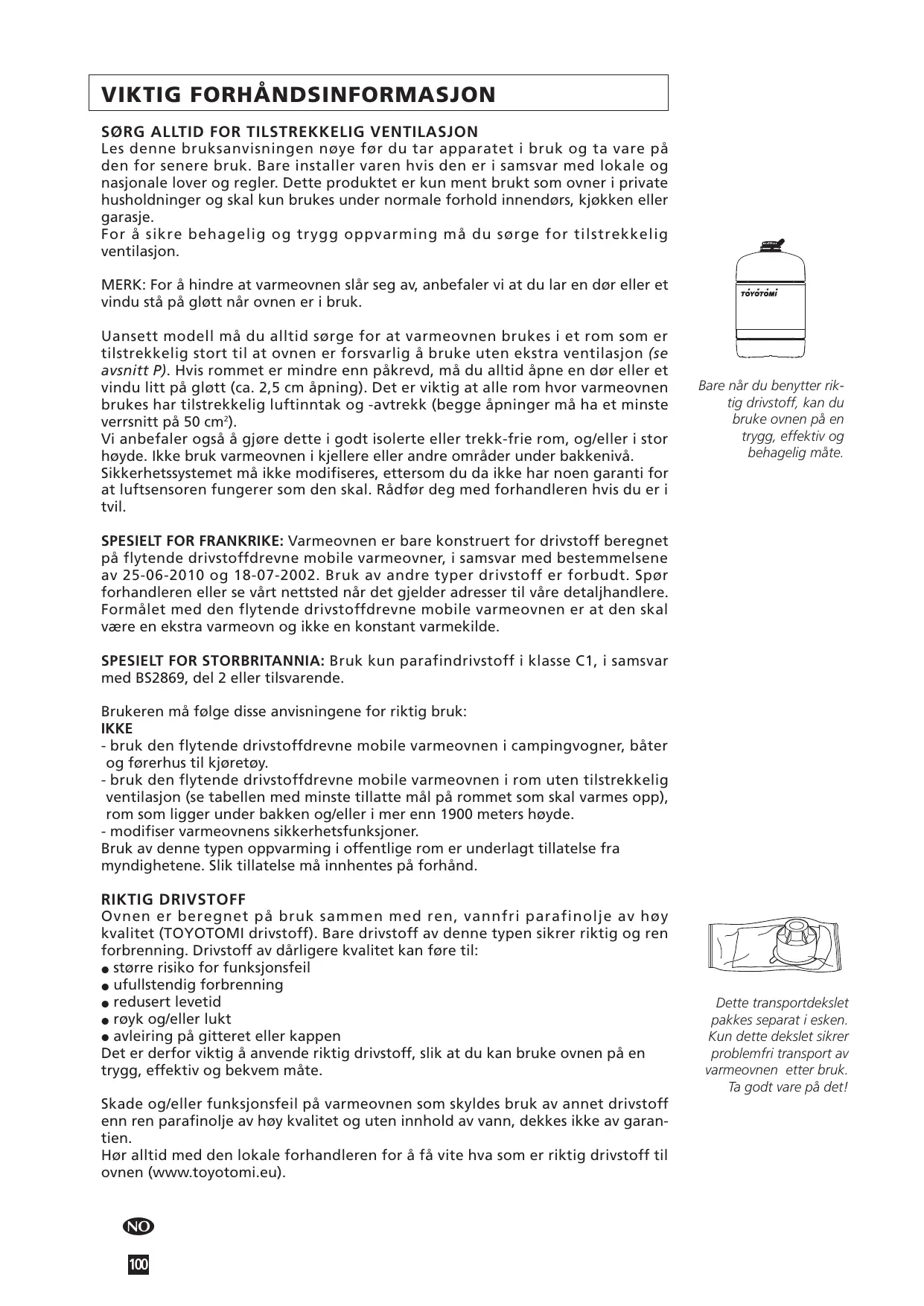 Un combustible approprié est donc essentiel pour un usage sûr et durable de votre appareil. La garantie ne couvre pas les dommages et/ou pannes de l´appareil mobile de chauffage causés par l’utilisation d’un combustible autre que celui qui est recommandé. Pour connaître le combustible le mieux adapté, consultez votre revendeur (www.toyotomi.eu).