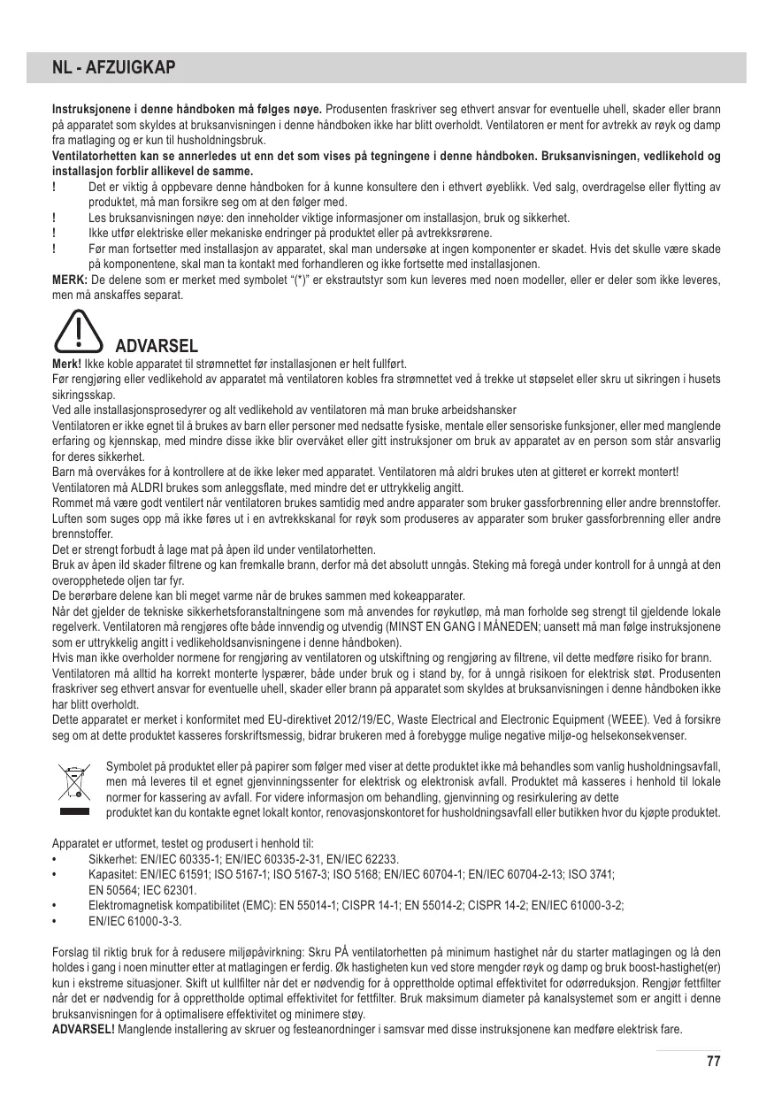 Les enfants doivent être surveillés afin qu’ils ne jouent pas avec l’appareil. Ne jamais utiliser la hotte sans que la grille ne soit montée correctement! La hotte ne doit JAMAIS être utilisée comme plan pour déposer quelque chose sauf si cela est expressément indiqué. Quand la hotte est utilisée en même temps que d’autres appareils à combustion de gaz ou d’autres combustibles, le local doit disposer d’une ventilation suffisante. L’air aspiré ne doit jamais être envoyé dans un conduit utilisé pour l’évacuation des fumées produites par des appareils à combustion de gaz ou d’autres combustibles. Il est formellement interdit de faire flamber les aliments sous la hotte. L’utilisation de flammes libres peut entraîner des dégâts aux filtres et peut donner lieu à des incendies, il faut donc les éviter à tout prix. La friture d’aliments doit être réalisée sous contrôle pour éviter que l’huile surchauffée ne prenne feu. Les pièces accessibles peuvent se réchauffer de façon importante quand elles sont utilisées avec des appareils pour la cuisson. En ce qui concerne les mesures techniques et de sécurité à adopter pour l’évacuation des fumées, s’en tenir strictement à ce qui est prévu dans les règlements des autorités locales compétentes. La hotte doit être régulièrement nettoyée, aussi bien à l’intérieur qu’à l’extérieur (AU MOINS UNE FOIS PAR MOIS, respecter néanmoins les instructions relatives à l’entretien fournies dans ce manuel). La non observation de ces normes de nettoyage de la hotte et du changement et nettoyage des filtres comporte des risques d’incendie. Ne pas utiliser ou laisser la hotte sans que les ampoules soient correctement placées pour éviter tout risque de choc électrique. La société décline toute responsabilité pour d’éventuels inconvénients, dégâts ou incendies provoqués par l’appareil et dérivés de la non observation des instructions reprises dans ce manuel. Cet appareil porte le symbole du recyclage conformément à la Directive Européenne 2012/19/CE concernant les Déchets d’Équipements Électriques et Électroniques (DEEE ou WEEE). En procédant correctement à la mise au rebut de cet appareil, vous contribuerez à empêcher toute conséquence nuisible pour l’environnement et la santé de l’homme. Le symbole présent sur l’appareil ou sur la documentation qui l’accompagne indique que ce produit ne peut en aucun cas être traité comme déchet ménager. Il doit par conséquent être remis à un centre de collecte des déchets chargé du recyclage des équipements électriques et électroniques. Pour la mise au rebut, respectez les normes relatives à l’élimination des déchets en vigueur dans le pays d’installation. Pour obtenir de plus amples détails au sujet du traitement, de la récupération et du recyclage de cet appareil, veuillez vous adresser au bureau compétent de votre commune, à la société de collecte des déchets ou directement à votre revendeur.
