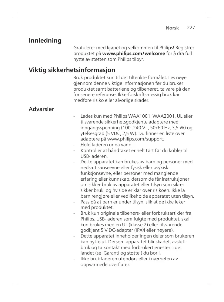 - Utilisez exclusivement des accessoires ou des consommables de la marque Philips. Utilisez uniquement le chargeur USB fourni avec le produit avec un adaptateur SV CC (IPX4 ou supérieur) homologué UL (classe 2) ou équivalent.