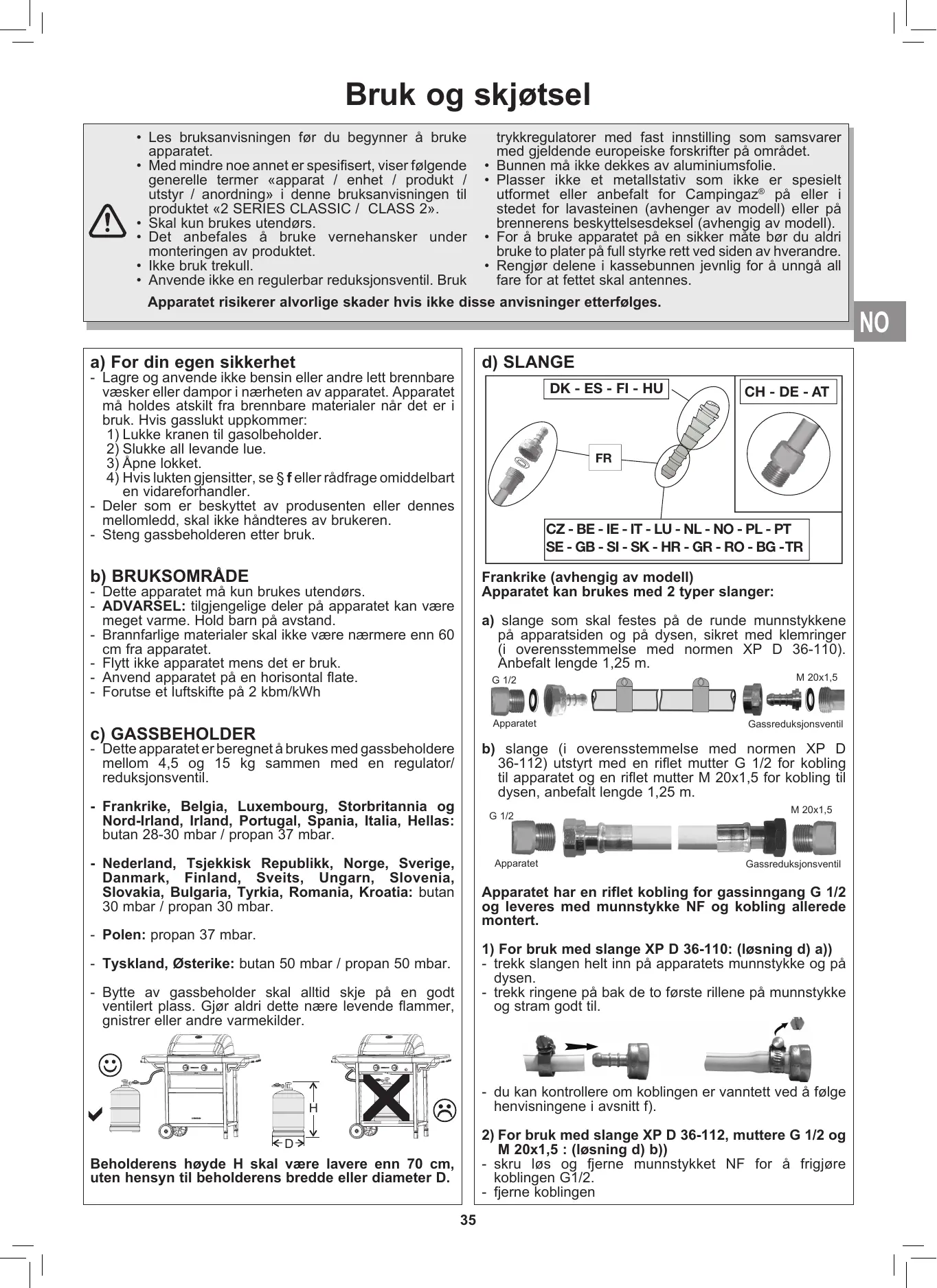 Les bruksanvisningen for du begynner à bruke apparatet. Med mindre noe annet er spesifisert, viser falgende generelle termer «apparat / enhet / produkt / utstyr / anordning» i denne bruksanvisningen til produktet «2 SERIES CLASSIC / CLASS 2». VAN + Skal kun brukes utendors. Det anbefales à bruke vernehansker under monteringen av produktet. Ikke bruk trekull. + Anvende ikke en regulerbar reduksjonsventil. Bruk