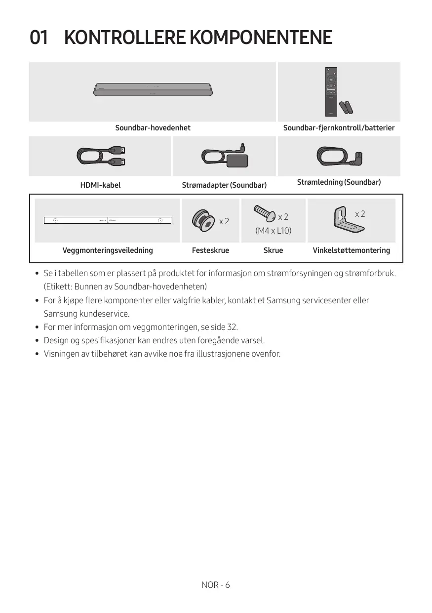 MERKNADER + Sarg for at Soundbar er plassert pà et flatt og fast underlag. + Enutilstrekkelig avstand fra TV-en kan resultere i problemer med akustikken.