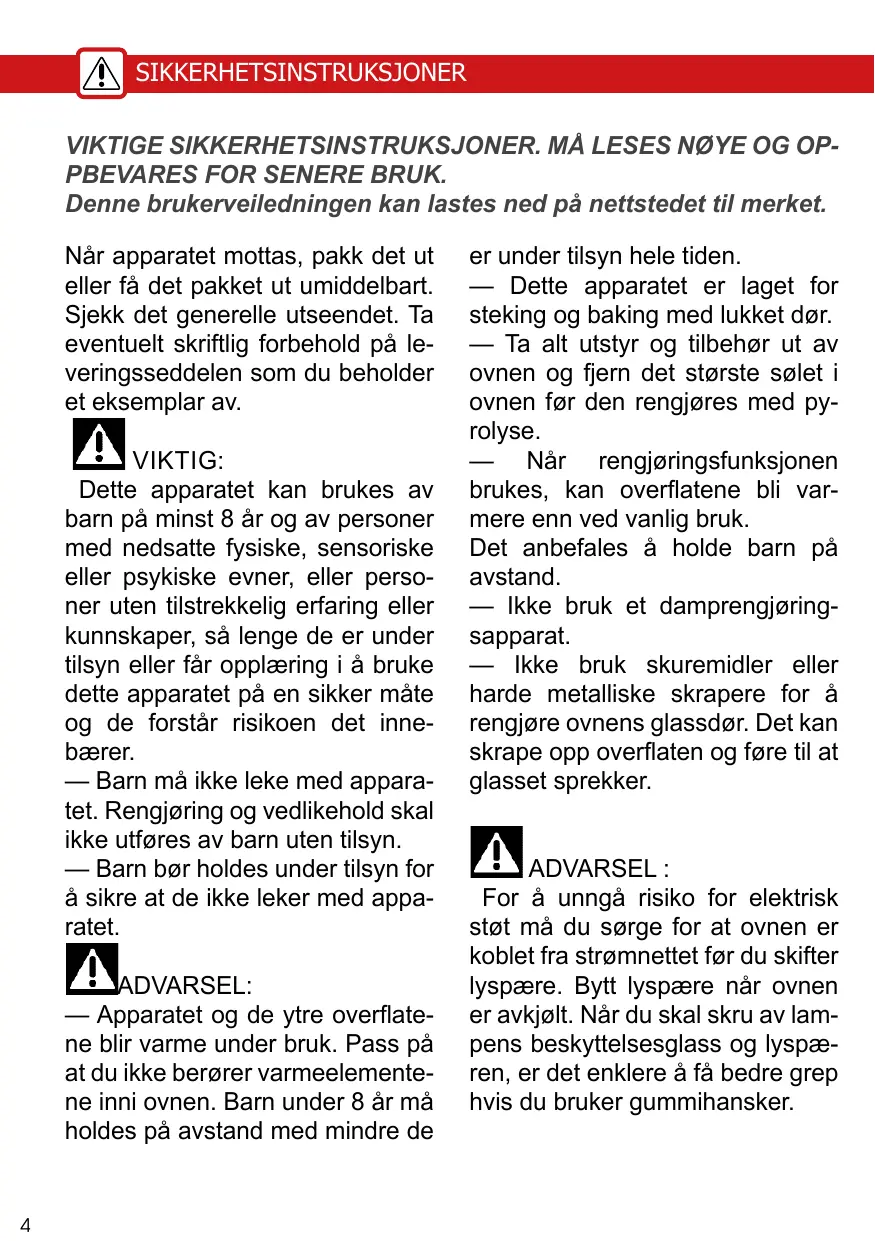Beskrivelse av apparatet TILBEHGR (avhengig av modell) + Sikkerhetsrist som hindrer velting Risten kan brukes som underlag for alle slags for- mer og brett med retter som skal stekes eller grati- neres. Den kan ogsâ brukes til grilling (matvarene legges rett pà risten). Sett inn risten med den forhayde kanten innerst. « Flerbrukspanne 45mm Settes inn i rillene under risten. Pannen brukes til 8 samle opp kraft og fett fra grilling pé risten. Den kan brukes halvfull med vann til vannbad. + Flerbrukspanne 20mm Nr pannen er satt inn i rillene, gjor skréplanet det enkelt 4 legge matvarer i en panne eller form. Platen kan ogsâ settes i en av rillene under risten for à samle opp kraft og fett fra griling. + Bakeplate 8mm Sat inn i rllene. Egner seg til smkaker, sandkaker, muffins. Skräplanet gjer det enkelt à legge matvarer i en panne eller form. Platen kan ogsé settes i en av rillene under risten for à samle opp kraft og fett fra griling. QI RÂD: For à unngä mye matos fra steking av fett kjott anbefaler vi à ha litt vann eller olje i bunnen av flerbrukspannen 45 mm.