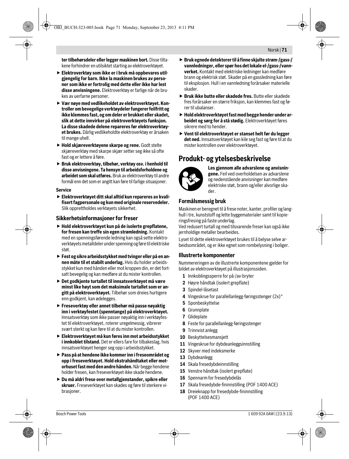 31 Parallellanlegg* “llustrert eller beskrewet tilbehor inngär ikke i standardleveran- sen. Det komplette tilbehgret finner du i vârt tilbeharsprogram. Tekniske data Overfres POF 1200 AE POF 1400 ACE| Produktnummer 3603B6AO.1 3603B6C 7.1 Opptatt effekt W 1200 1400 Tomgangsturtall min? 11000 -28000 11000-28000 Turtallforvalg . . Konstantelektronikk - Q Kontakt for stevavsuging . . Verktoyfeste mm 6/8 6/8 inch Li % Fresekurvslag mm 55 55 Vekttilsvarende EPTA-Procedure 01/2003 kg 3,4 3,5 Beskyttelsesklasse Eu En