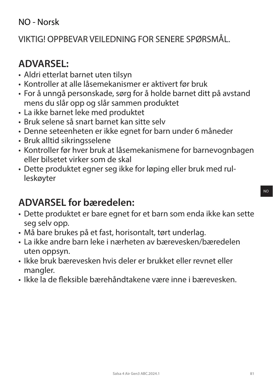 + Kontroller for hver bruk at lâsemekanismene for barnevognbagen eller bilsetet virker som de skal