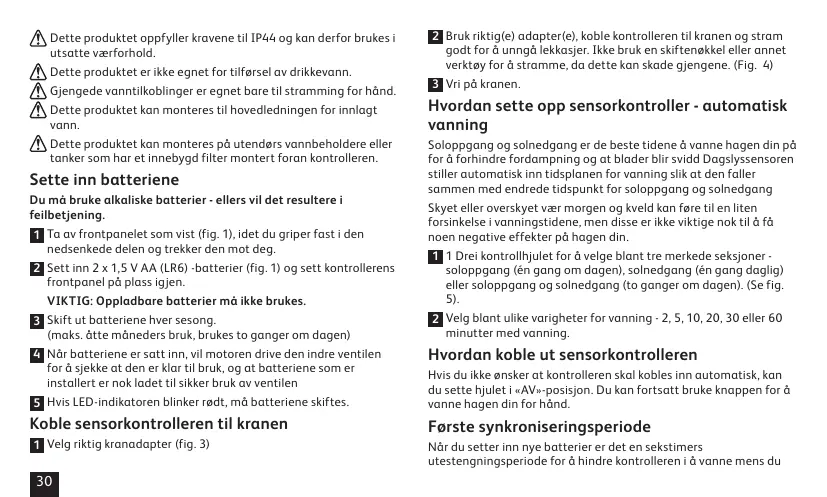 Feilforebyggingsmodus En innebygd sikkerhetsfunksjon oppdager nâr batterinivéet har sunket tie nivé som kan foret svikt mens ventilen er pen, 0e som resulterer at det Kastes bort vann. Sikkerhetsmodus forhindrer at kontroleren ss pà for batteriene er byttet ut. LED-indikator. Iyset vil binke rodt nàrfeilforebyggingsmoduset er aktivert. Vann në funksjonen vil heler ke rke for batteriene er skiftet ut.