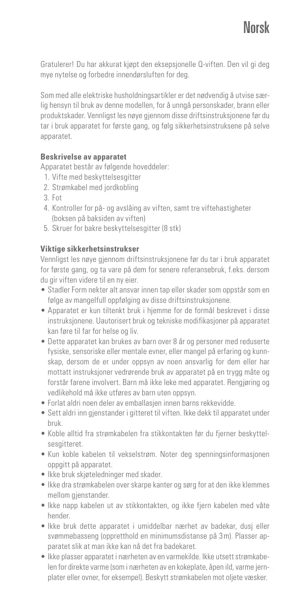 Viktige sikkerhetsinstrukser Vemnligst les noye gjennom driftsinstruksjonene far du tar i bruk apparatet for farste gang, og ta vare pà dem for senere referansebruk, f.eks. dersom du gir viften videre til en ny eier + Stadler Form nekter alt ansvar innen tap eller skader som oppstär som en falge av mangelfull oppfolging av disse driftsinstruksjonene. + Apparatet er kun tiltenkt bruk i hjemme for de formäl beskrevet i dise instruksjonene. Uautorisert bruk og tekniske modifikasjoner pà apparatet Kan fare til far for helse og Ii. + Dette apparatet kan brukes av barn over 8 är og personer med reduserte fysiske, sensoriske eller mentale evner, eller mangel pä erfaring og kunn- skap, dersom de er under oppsyn av noën ansvarlig for dem eller har mottatt instruksjoner vedrarende bruk av apparatet pà en trygg mâte og forstär farene involvert. Barn mà ikke leke med apparatet. Rengjaring og vediikehold mà ikke utfares av barn uten oppsyn Forlat aldri noen deler av emballasjen innen barns rekkevidde: + Settaldri inn gjenstander gitteret til viften. Ikke dekk til apparatet under bruk + Koble allid fra stromkabelen fra stikkontakten far du fjerner beskyttel- sesgitteret. + Kun koble kabelen til vekselstram. Noter deg spenningsinformasjonen oppgitt pà apparatet. + kke bruk skjoteledninger med skader. + Ikke dra stromkabelen over skarpe kanter ag sarg for at den ikke klemmes mellom gjenstander. + lkke napp kabelen ut av stikkontakten, og ikke fjern kabelen med vète hender. + lkke bruk dette apparatet 1 umiddelbar nærhet av badekar, dus) eller svammebasseng loppretthold en minimumsdistanse pä 3 mi. Plasser ap- paratet slik at man ikke kan n det fra badekaret. + Ikke plasser apparatet i nærheten av en varmeklde. Ikke utsett stromkabe- len for direkte varme (som i nærheten av en kokeplate, pen id, varme jern- plater eller ovner, for eksempell. Beskytt stromkabelen mot oljete væzsker.
