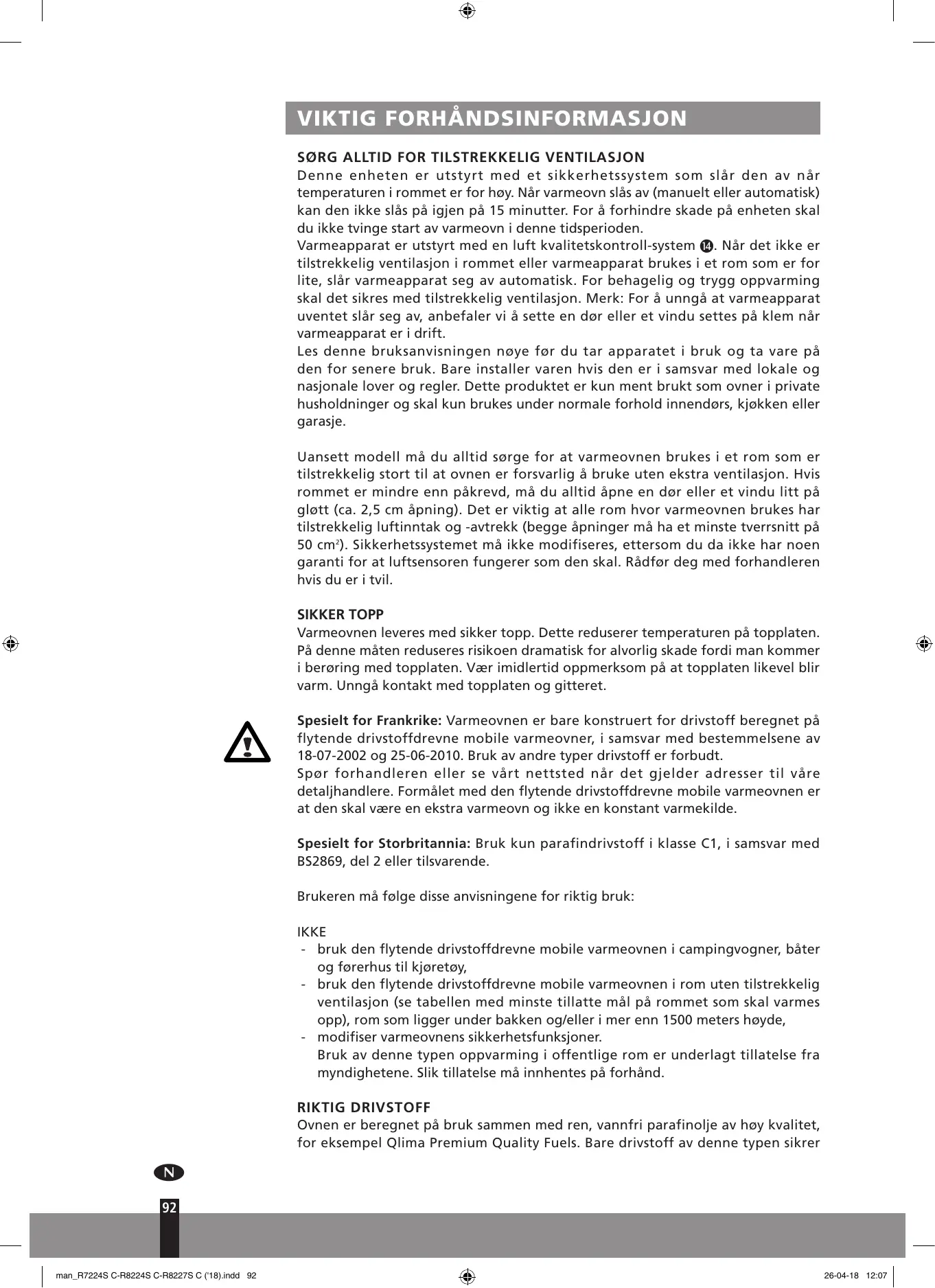 + Chaque pièce où le chauffage mobile à combustible liquide est utilisé doit être munie d'une entrée d'air suffisante et d'une sortie d'air efficace (section minimale de 50 cm? pour chaque orifice). Eviter tout contact avec la grille qui peut être très chaude.