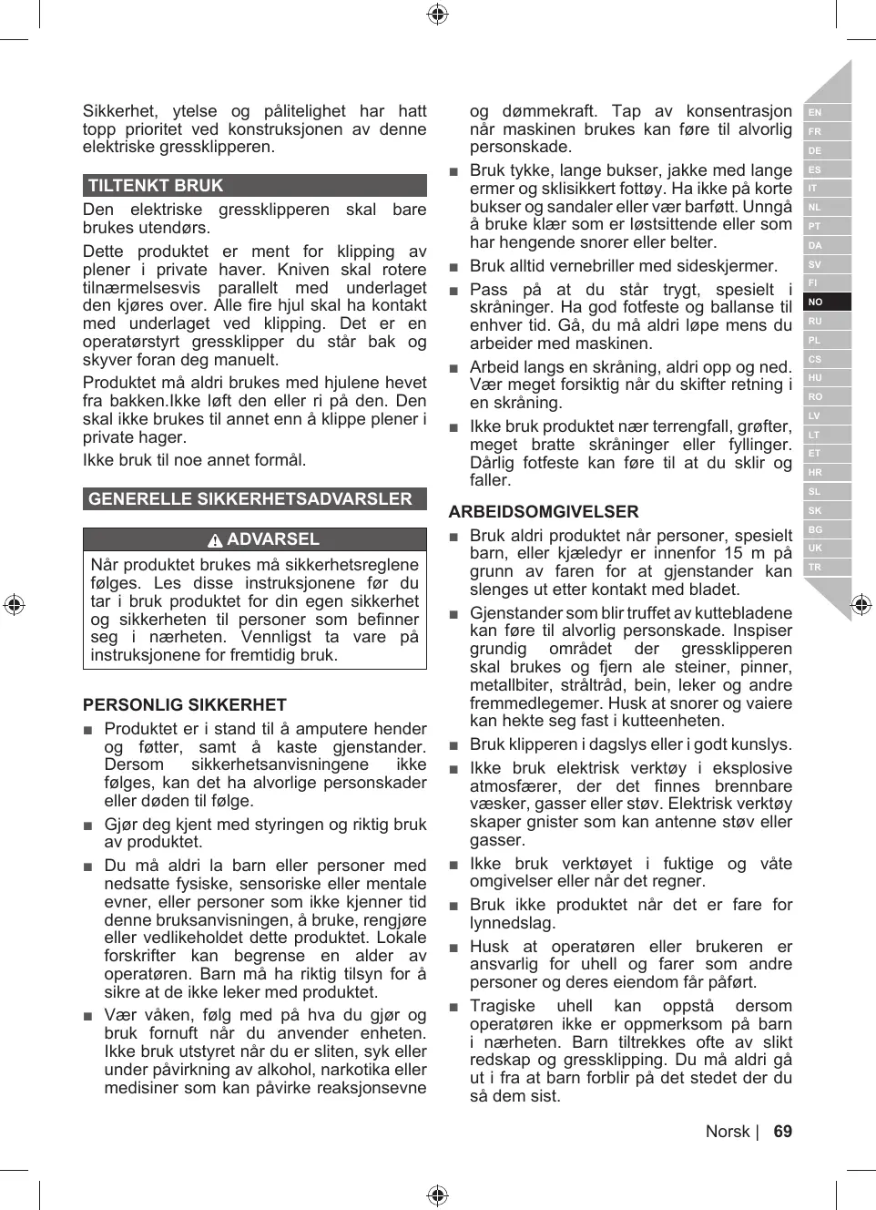 = La tondeuse à gazon est capable d'amputer les mains et les pieds, ainsi que de projeter des objets. Le non-respect de toutes les règles de sécurité est susceptible d'entraîner des blessures graves voire mortelles.